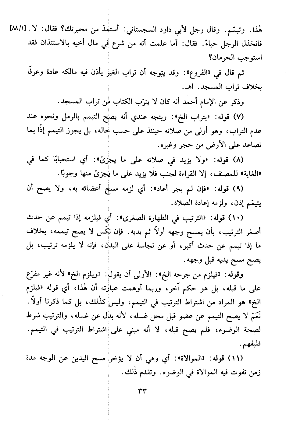 (11) قوله: "الموالاة": أي وهي أن لا يؤخر مسح اليدين عن الوجه مدة زمن تفوت فيه الموالاة في الوضوء. وتقدم ذلك.