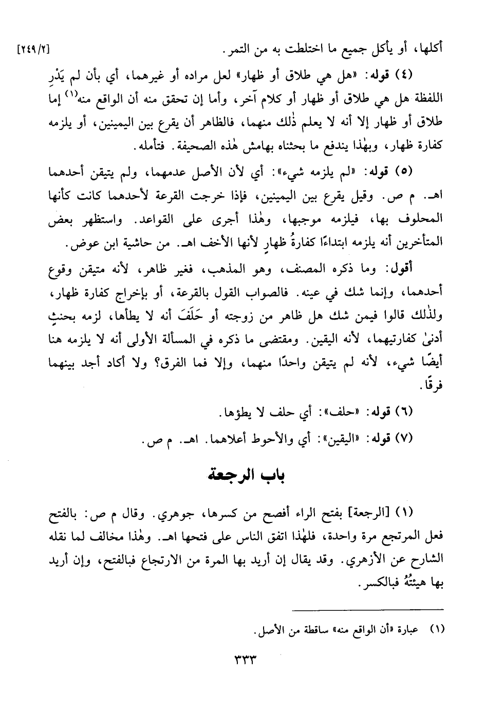 (1) [الرجعة] بفتح الراء أفصح من كسرها، جوهري. وقال م ص: بالفتح فعل المرتجع مرة واحدة، فلهذا اتفق الناس على فتحها اهـ. وهذا مخالف لما نقله الشارح عن الأزهري. وقد يقال إن أريد بها المرة من الارتجاع فبالفتح، وإن أريد بها هيئتُهُ فبالكسر.