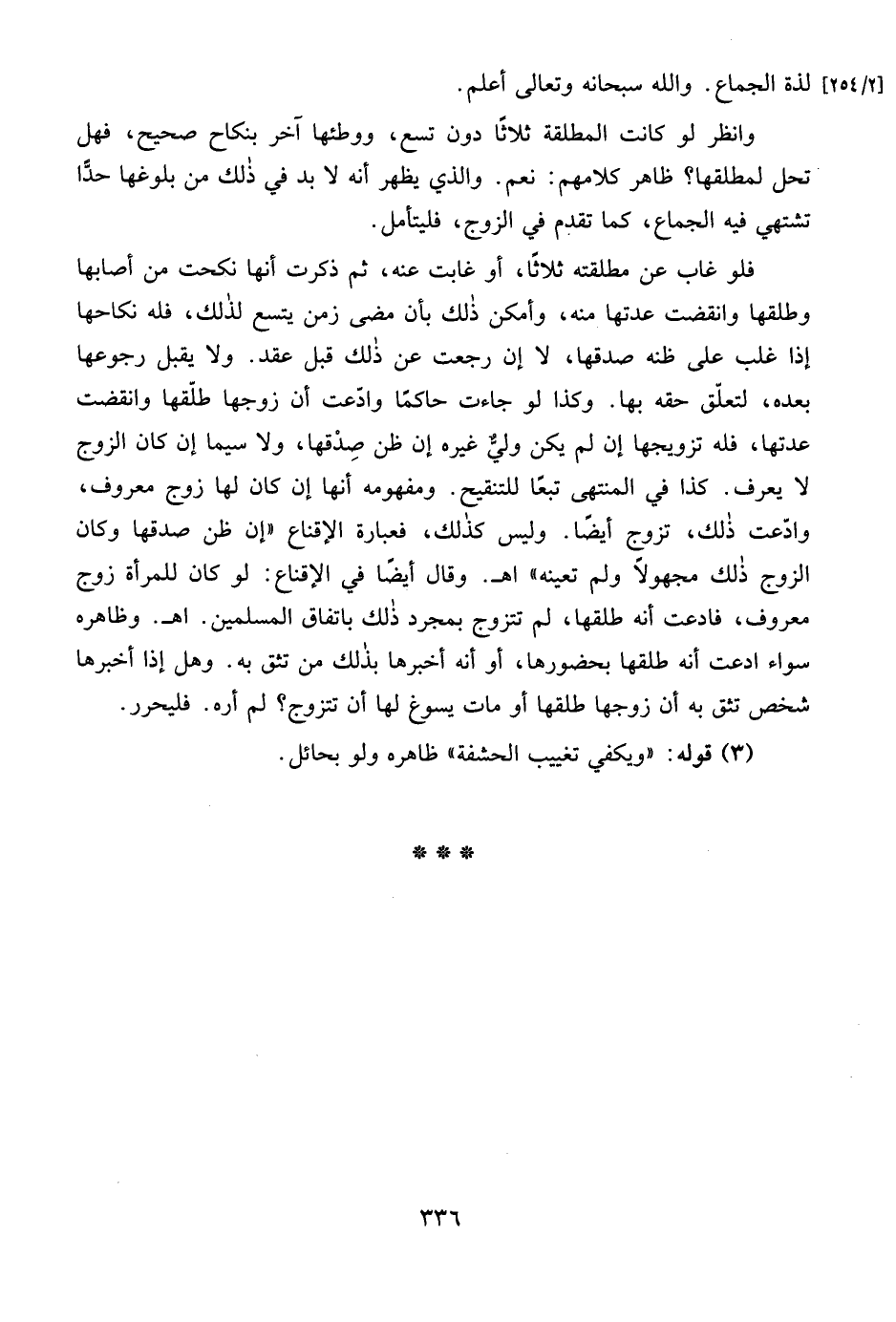 وانظر لو كانت المطلقة ثلاثًا دون تسع، ووطئها آخر بنكاح صحيح، فهل تحل لمطلقها؟ ظاهر كلامهم: نعم. والذي يظهر أنه لا بد في ذلك من بلوغها حدًّا تشتهي فيه الجماع، كما تقدم في الزوج، فليتأمل.