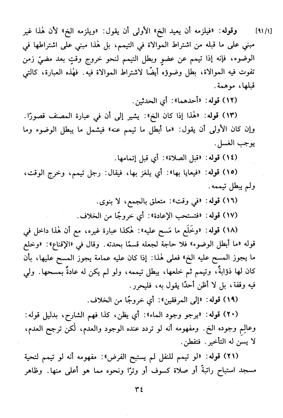 [1/ 91] وقوله: "فيلزمه أن يعيد الخ" الأولى أن يقول: "ويلزمه الخ" لأن هذا غير مبني على. ما قبله من اشتراط الموالاة في التيمم، بل هذا مبني على اشتراطها في الوضوء، فإنه إذا تيمم عن عضو وبطل التيمم لنحو خروج وقتِ بعد مضيّ زمن تفوت فيه الموالاة، بطل وضوؤه أيضاً لاشتراط الموالاة فيه. فهذه العبارة، كالتي قبلها، موهمة.