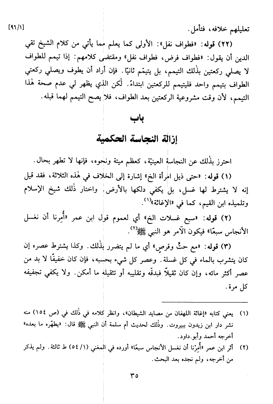 (¬1) يعني كتابه "إغاثة اللهفان من مصايد الشيطان"، وانظر كلامه في ذلك في (ص 154) منه نشر دار ابن زيدون ببيروت. وفلك لحديث أم سلمة أن النبي - صلى الله عليه وسلم - قال: "يطهره ما بعد" أخرجه أحمد وأبو. داود.