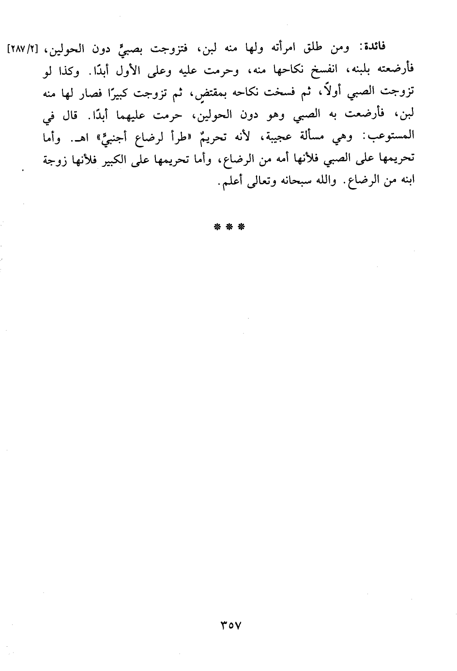 فائدة: ومن طلق امرأته ولها منه لبن، فتزوجت بصبيٍّ دون الحولين، [2/ 287] فأرضعته بلبنه، انفسخ نكاحها منه، وحرمت عليه وعلى الأول أبدًا. وكذا لو تزوجت الصبي أولاً، ثم فسخت نكاحه بمقتضٍ، ثم تزوجت كبيرًا فصار لها منه لبن، فأرضعت به الصبي وهو دون الحولين، حرمت عليهما أبدًا. قال في المستوعب: وهي مسألة عجيبة، لأنه تحريمٌ "طرأ لرضاع أجنبيٍّ" اهـ. وأما تحريمها على الصبي فلأنها أمه من الرضاع، وأما تحريمها على الكبير فلأنها زوجة ابنه من الرضاع. والله سبحانه وتعالى أعلم.