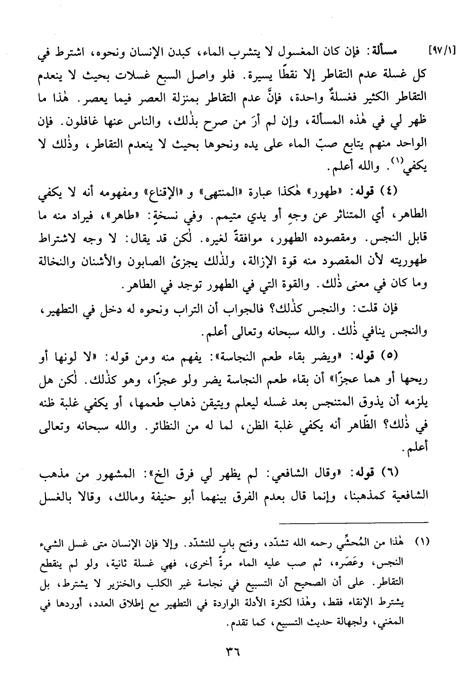 [1/ 97] مسألة: فإن كان المغسول لا يتشرب الماء، كبدن الإنسان ونحوه، اشترط في كل غسلة عدم التقاطر إلا نقطًا يسيرة. فلو واصل السبع غسلات بحيث لا ينعدم التقاطر الكثير فغسلةٌ واحدة، فإن عدم التقاطر بمنزلة العصر فيما يعصر. هذا ما ظهر لي في هذه المسألة، وإن لم أرَ من صرح بذلك، والناس عنها غافلون. فإن الواحد منهم يتابع صبّ الماء على يده ونحوها بحيث لا ينعدم التقاطر، وذلك لا يكفي (¬1). والله أعلم.