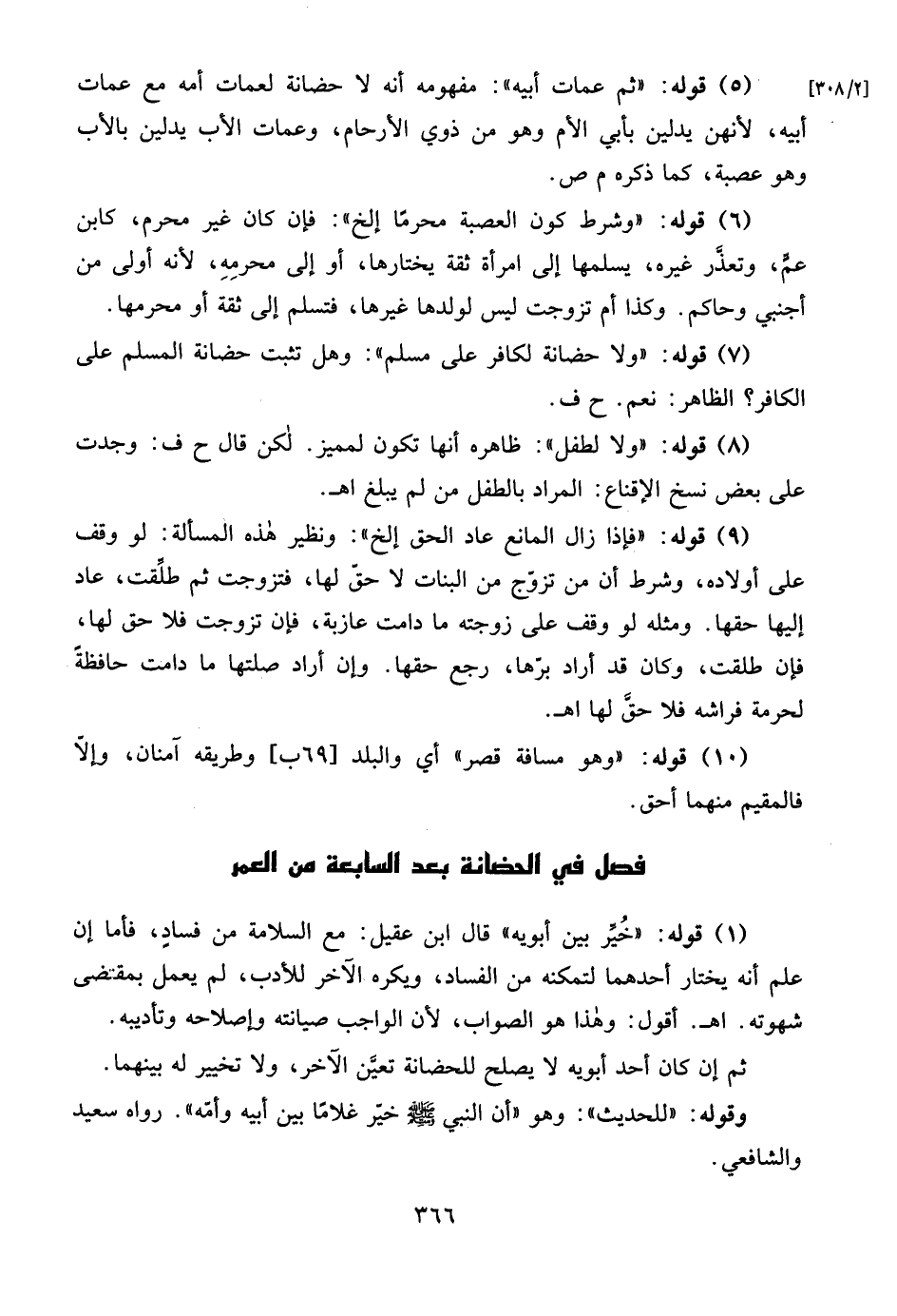 [2/ 308] (5) قوله: "ثم عمات أبيه": مفهومه أنه لا حضانة لعمات أمه مع عمات أبيه، لأنهن يدلين بأبي الأم وهو من ذوي الأرحام، وعمات الأب يدلين بالأب وهو عصبة، كما ذكره م ص.
