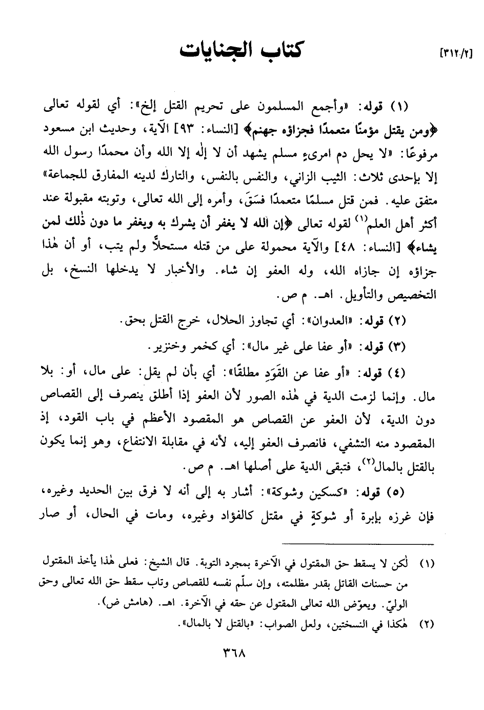 (¬1) لكن لا يسقط حق المقتول في الآخرة بمجرد التوبة. قال الشيخ: فعلى هذا يأخذ المقتول من حسنات القاتل بقدر مظلمته، وإن سلّم نفسه للقصاص وتاب سقط حق الله تعالى وحق الوليّ. ويعوّض الله تعالى المقتول عن حقه في الآخرة. اهـ. (هامش ض).