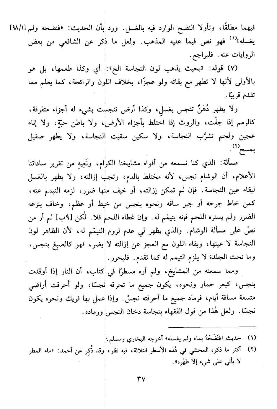 (¬2) أكثر ما ذكره المحشي في هذه الأسطر الثلاثة، فيه نظر، وقد ذُكِر عن أحمد: "ماء المطر لا يأتي على شيء إلاطهّره".