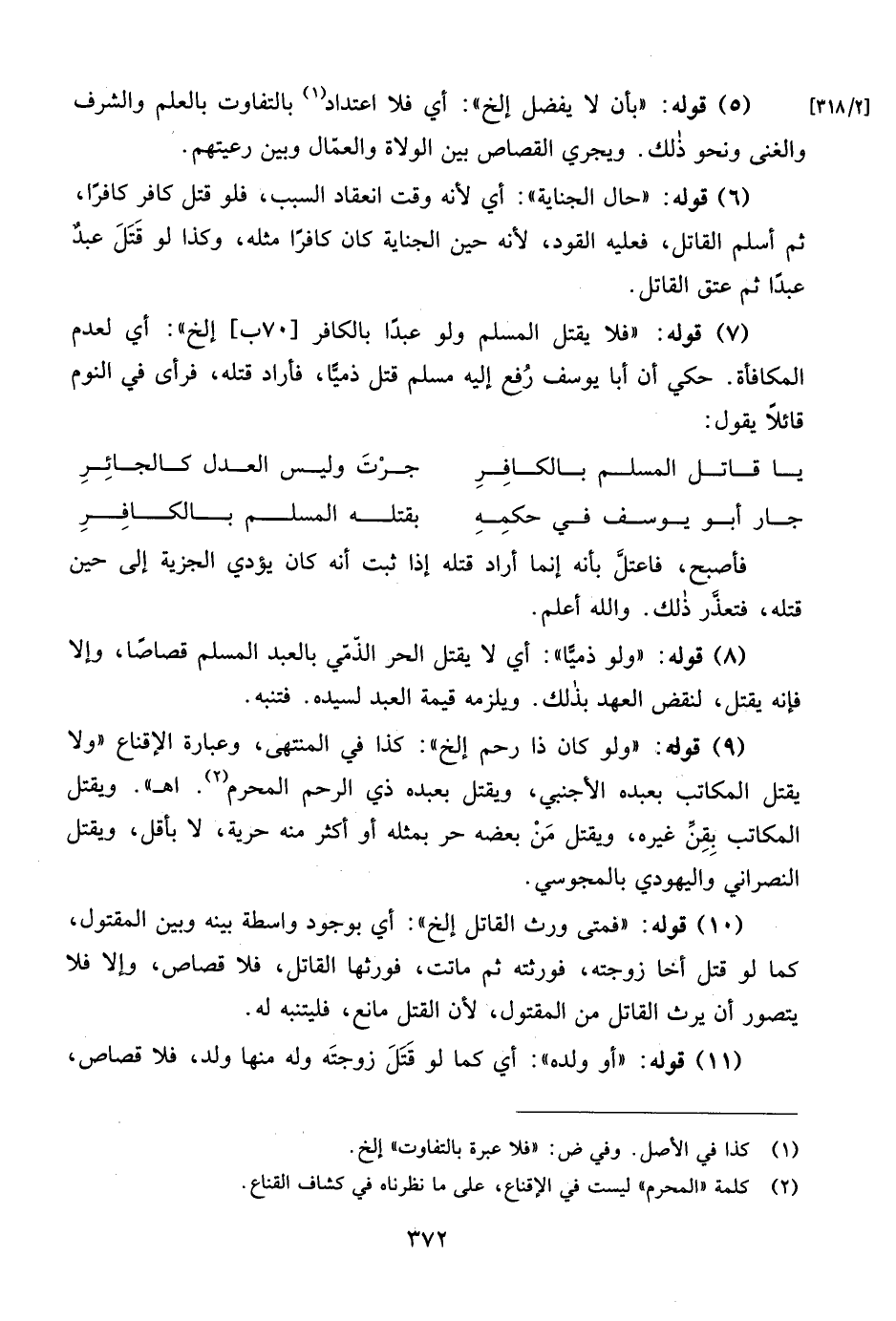 (6) قوله: "حال الجناية": أي لأنه وقت انعقاد السبب، فلو قتل كافر كافرًا، ثم أسلم القاتل، فعليه القود، لأنه حين الجناية كان كافرًا مثله، وكذا لو قَتَلَ عبدٌ عبدًا ثم عتق القاتل.