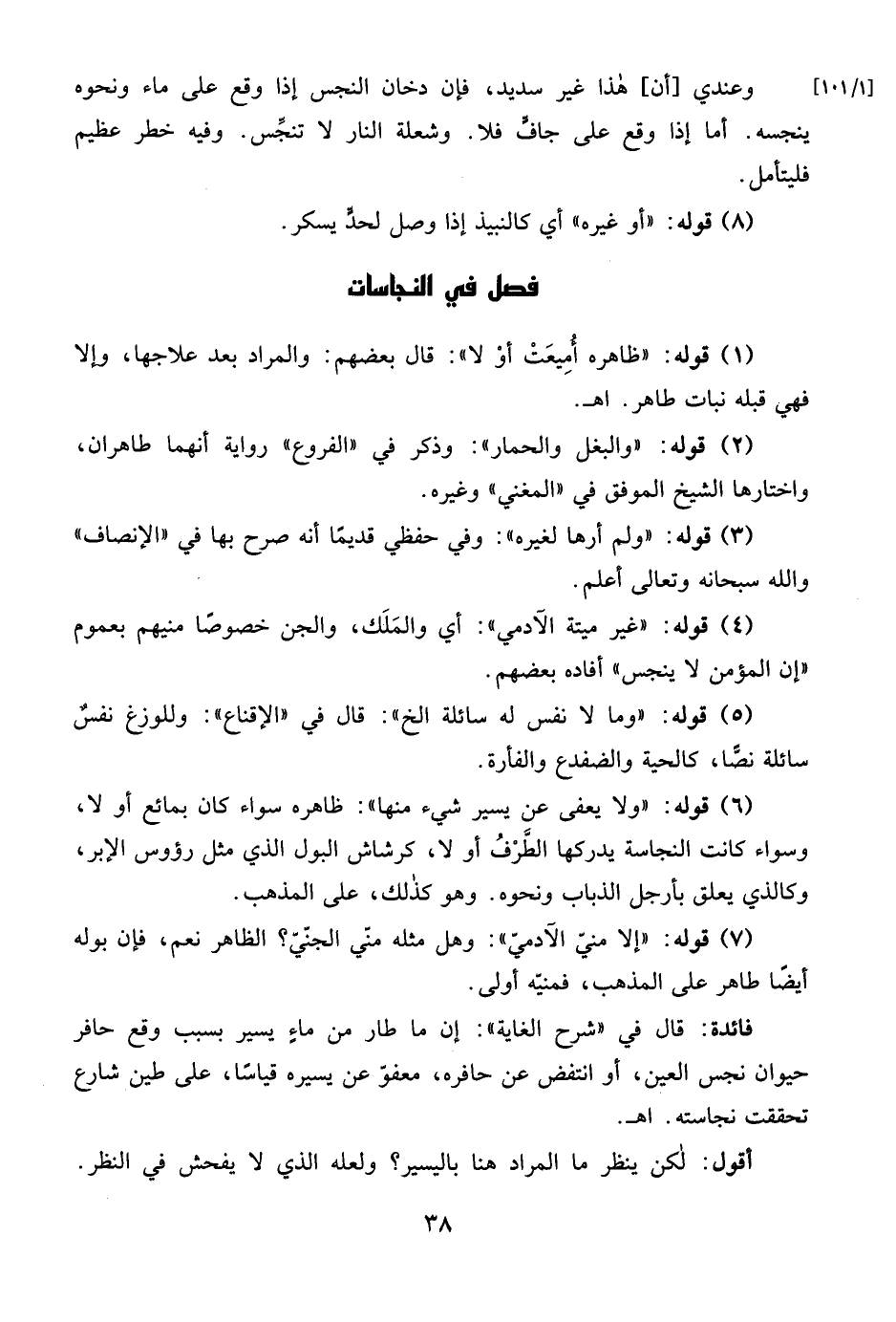 [1/ 101] وعندي [أن] هذا غير سديد، فإن دخان النجس إذا وقع على ماء ونحوه ينجسه. أما إذا وقع على جاف فلا. وشعلة النار لا تنجِّس. وفيه خطر عظيم فليتأمل.