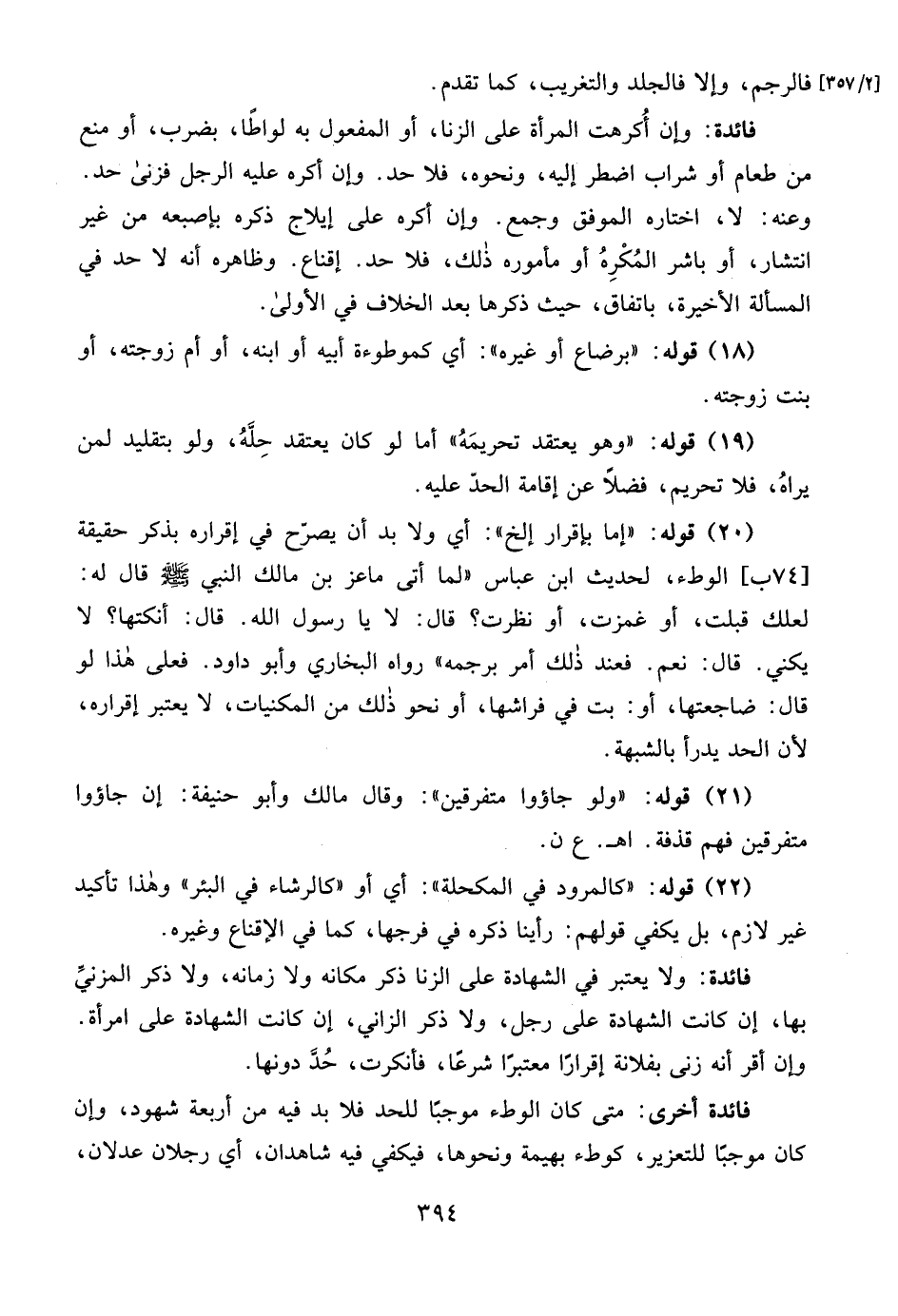(20) قوله: "إما لإقرار إلخ": أي ولا بد أن يصرّح في إقراره بذكر حقيقة [74ب] الوطء، لحديث ابن عباس "لما أتى ماعز بن مالك النبي - صلى الله عليه وسلم - قال له: لعلك قبلت، أو غمزت، أو نظرت؟ قال: لا يا رسول الله. قال: أنكتها؟ لا يكني. قال: نعم. فعند ذلك أمر برجمه" رواه البخاري وأبو داود. فعلى هذا لو قال: ضاجعتها، أو: بت في فراشها، أو نحو ذلك من المكنيات، لا يعتبر إقراره، لأن الحد يدرأ بالشبهة.