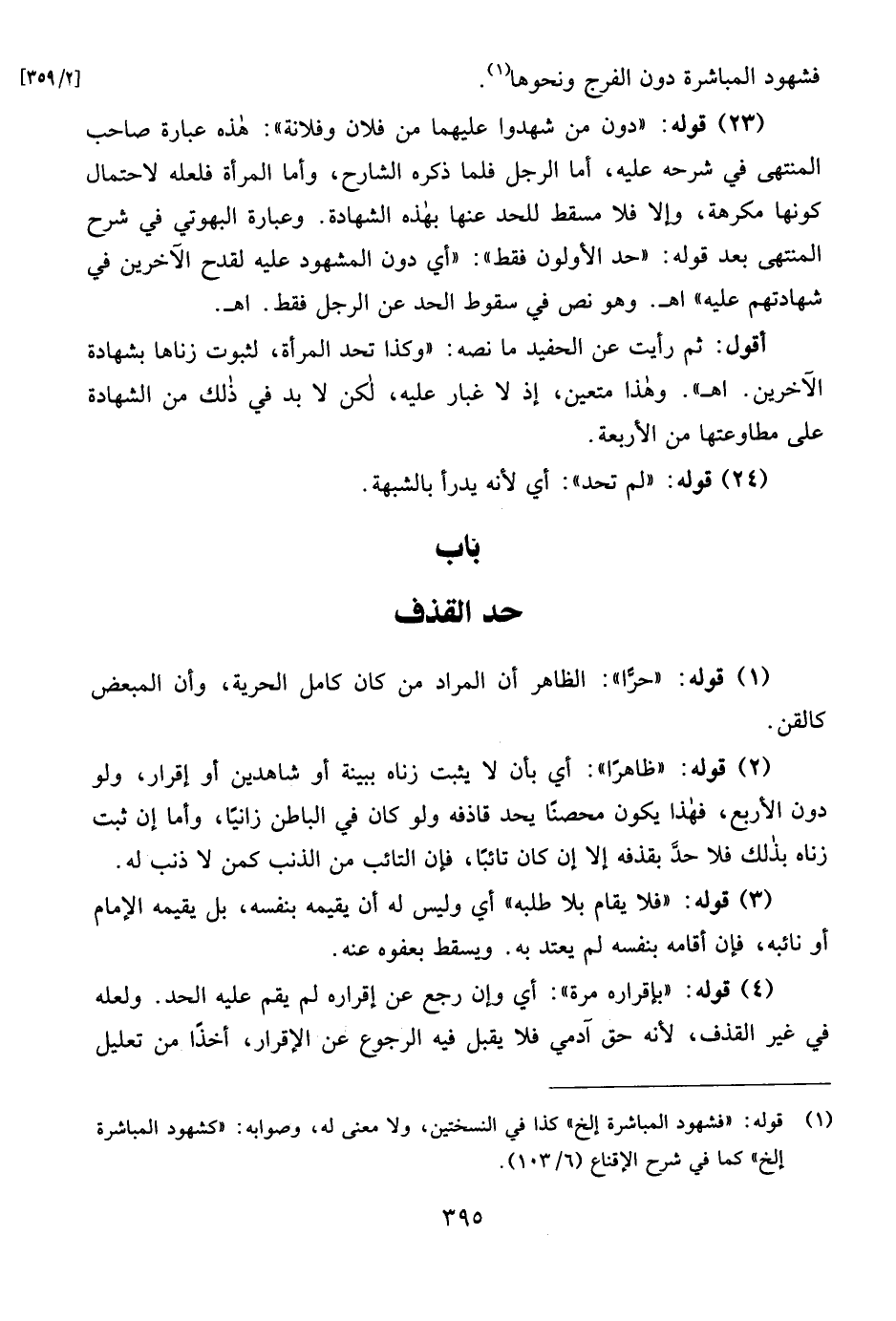 (23) قوله: "دون من شهدوا عليهما من فلان وفلانة": هذه عبارة صاحب المنتهى في شرحه عليه، أما الرجل فلما ذكره الشارح، وأما المرأة فلعله لاحتمال كونها مكرهة، وإلا فلا مسقط للحد عنها بهذه الشهادة. وعبارة البهوتي في شرح المنتهى بعد قوله: "حد الأولون فقط": "أي دون المشهود عليه لقدح الآخرين في شهادتهم عليه" اهـ. وهو نص في سقوط الحد عن الرجل فقط. اهـ.