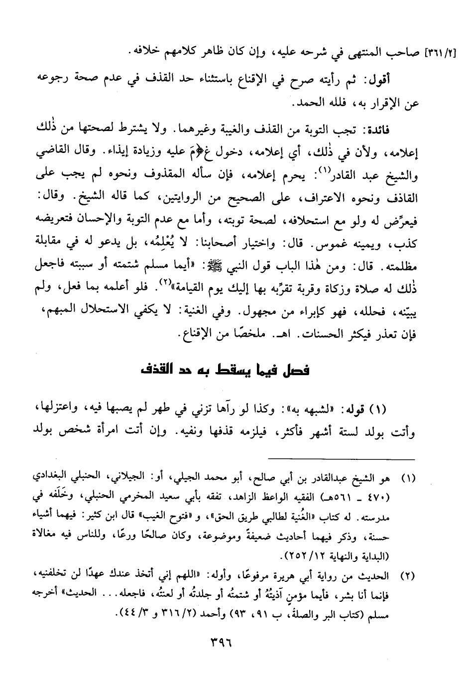 فائدة: تجب التوبة من القذف والغيبة وغيرهما. ولا يشترط لصحتها من ذلك إعلامه، ولأن في ذلك، أي إعلامه، دخول غ {مَ عليه وزيادة إيذاء. وقال القاضي والشيخ عبد القادر (¬1): يحرم إعلامه، فإن سأله المقذوف ونحوه لم يجب على القاذف ونحوه الاعتراف، على الصحيح من الروايتين، كما قاله الشيخ. وقال: فيعرِّض له ولو مع استحلافه، لصحة توبته، وأما مع عدم التوبة والإحسان فتعريضه كذب، ويمينه غموس. قال: واختيار أصحابنا: لا يُعْلِمُه، بل يدعو له في مقابلة مظلمته. قال: ومن هذا الباب قول النبي - صلى الله عليه وسلم -:"أيما مسلم شتمته أو سببته فاجعل ذلك له صلاة وزكاة وقربة تقرِّبه بها إليك يوم القيامة" (¬2). فلو أعلمه بما فعل، ولم يبينه، فحلله، فهو كإبراء من مجهول. وفي الغنية: لا يكفي الاستحلال المبهم، فإن تعذر فيكثر الحسنات. اهـ. ملخصًا من الإقناع.