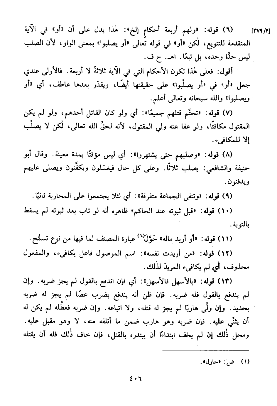 (6) قوله: "ولهم أربعة أحكامٍ إلخ": هذا يدل على أن "أو" في الآية المتقدمة للتنويع، لكن "أو" في قوله تعالى "أو يصلبوا" بمعنى الواو، لأن الصلب ليس حدًّا وحده، بل تبعًا. اهـ. ح ف.