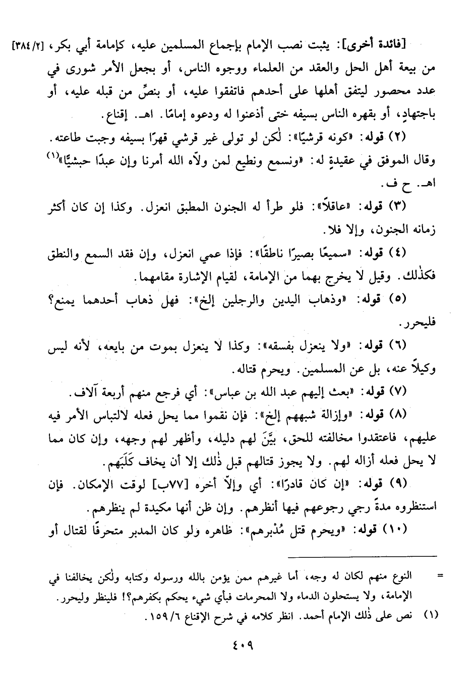 [فائدة أخرى]: يثبت نصب الإمام بإجماع المسلمين عليه، كإمامة أبي بكر، [2/ 384] من بيعة أهل الحل والعقد من العلماء ووجوه الناس، أو بجعل الأمر شورى في عدد محصور ليتفق أهلها على أحدهم فاتفقوا عليه، أو بنصِّ من قبله عليه، أو باجتهادٍ، أو بقهره الناس بسيفه ختى أذعنوا له ودعوه إمامًا. اهـ. إقناع.
