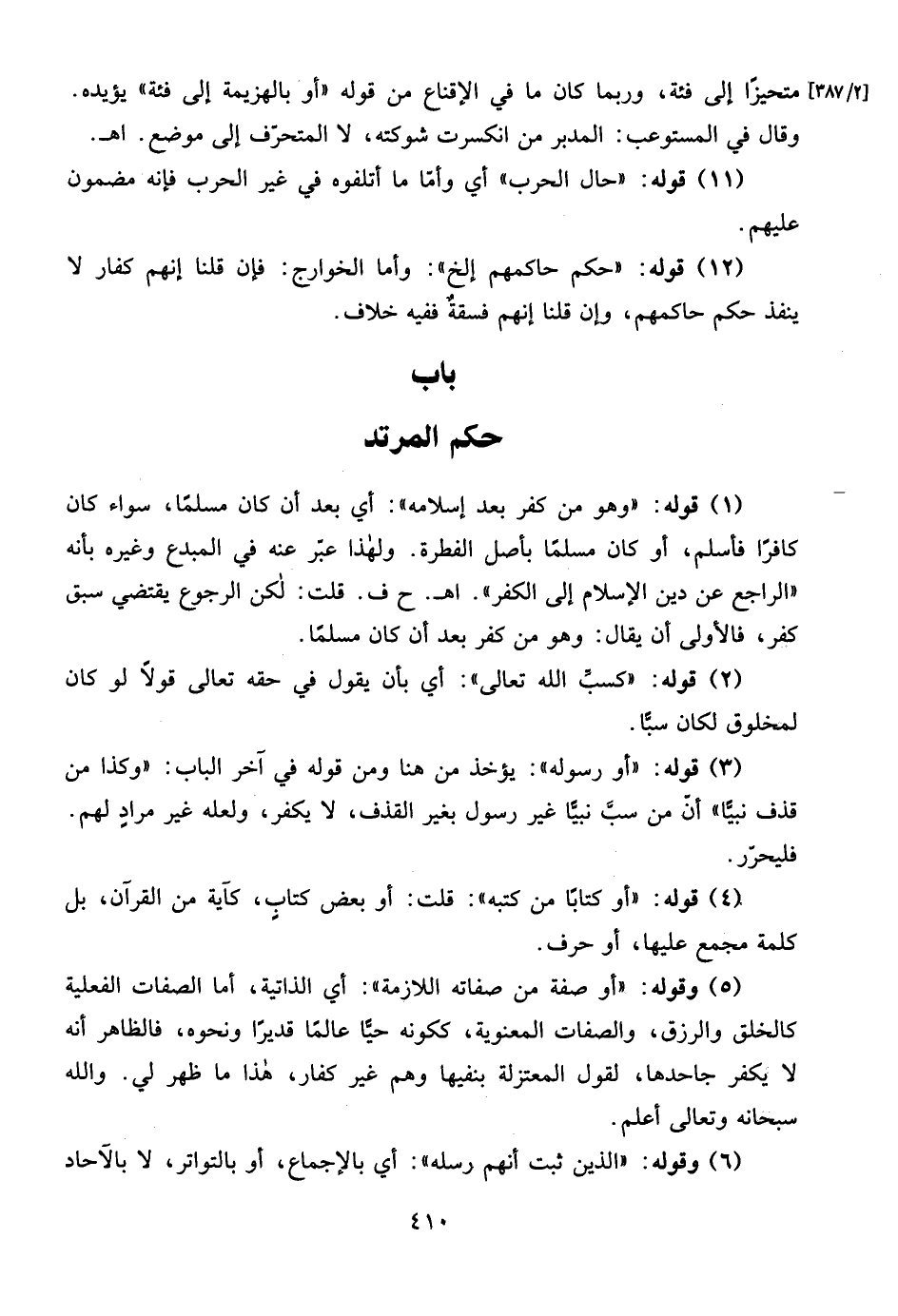 (1) قوله: "وهو من كفر بعد إسلامه": أي بعد أن كان مسلمًا، سواء كان كافرًا فأسلم، أو كان مسلمًا بأصل الفطرة. ولهذا عبّر عنه في المبدع وغيره بأنه "الراجع عن دين الإسلام إلى الكفر". اهـ. ح ف. قلت: لكن الرجوع يقتضي سبق كفر، فالأولى أن يقال: وهو من كفر بعد أن كان مسلمًا.