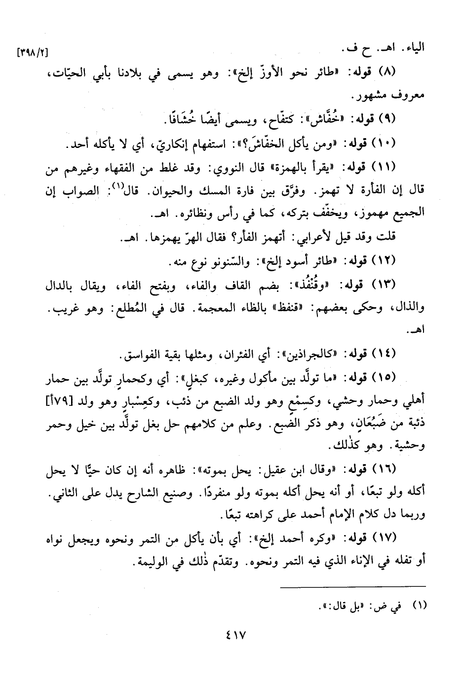 (13) قوله: "وقُنْفُذ": بضم القاف والفاء، وبفتح الفاء، ويقال بالدال والذال، وحكى بعضهم: "قنفظ" بالظاء المعجمة. قال في المُطلع: وهو غريب. اهـ.