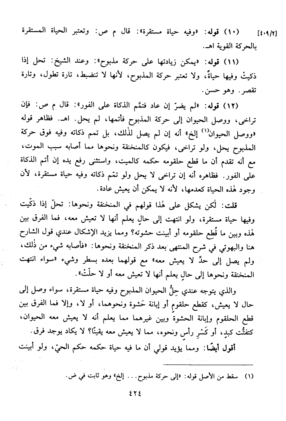 [2/ 409] (10) قوله: "وفيه حياة مستقرة": قال م ص: وتعتبر الحياة المستقرة بالحركة القوية اهـ.