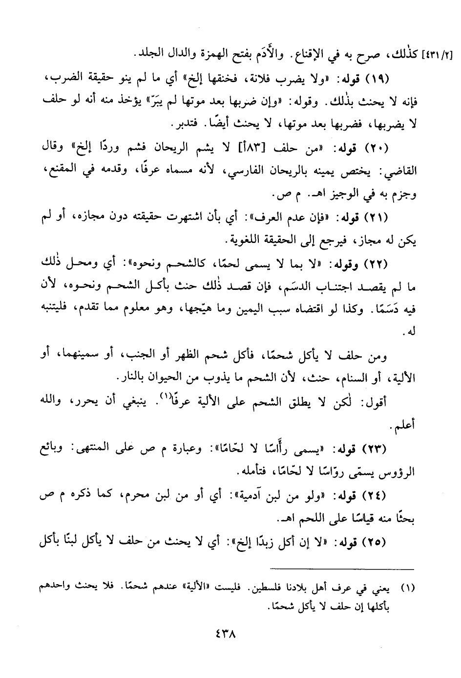 (¬1) يعني في عرف أهل بلادنا فلسطين. فليست "الألية" عندهم شحمًا. فلا يحنث واحدهم بأكلها إن حلف لا يأكل شحمًا.
