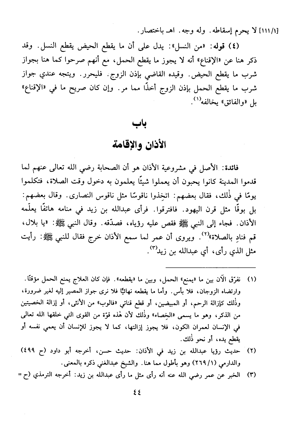 فائدة: الأصل في مشروعية الأذان هو أن الصحابة رضي الله تعالى عنهم لما قدموا المدينة كانوا يحبون أن يعملوا شيئًا يعلمون به دخول وقت الصلاة، فتكلموا يومًا في ذلك، فقال بعضهم: اتخِذوا ناقوسًا مثل ناقوس النصارى. وقال بعضهم: بل بوقًا مثل قرن اليهود. فافترقوا. فرأى عبد الله بن زيد في منامه هاتفًا يعلّمه الأذان. فجاء إلى النبي - صلى الله عليه وسلم - فقص عليه رؤياه، فصدّقه. وقال النبي - صلى الله عليه وسلم -: "يا بلال، قم فنادِ بالصلاة" (¬2). ويروى أن عمر لما سمع الأذان خرج فقال للنبي - صلى الله عليه وسلم -: رأيت مثل الذي رأى، أي عبد الله بن زيد (¬3).