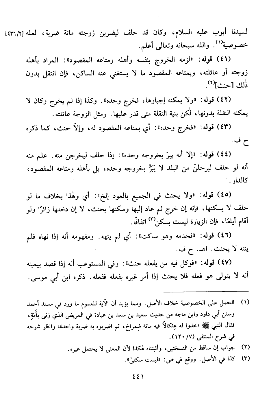 (41) قوله: "لزمه الخروج بنفسه وأهله ومتاعه المقصود": المراد بأهله زوجته أو عائلته، وبمتاعه المقصود ما لا يستغني عنه الساكن، فإن انتقل بدون ذلك [حنث] (¬2).