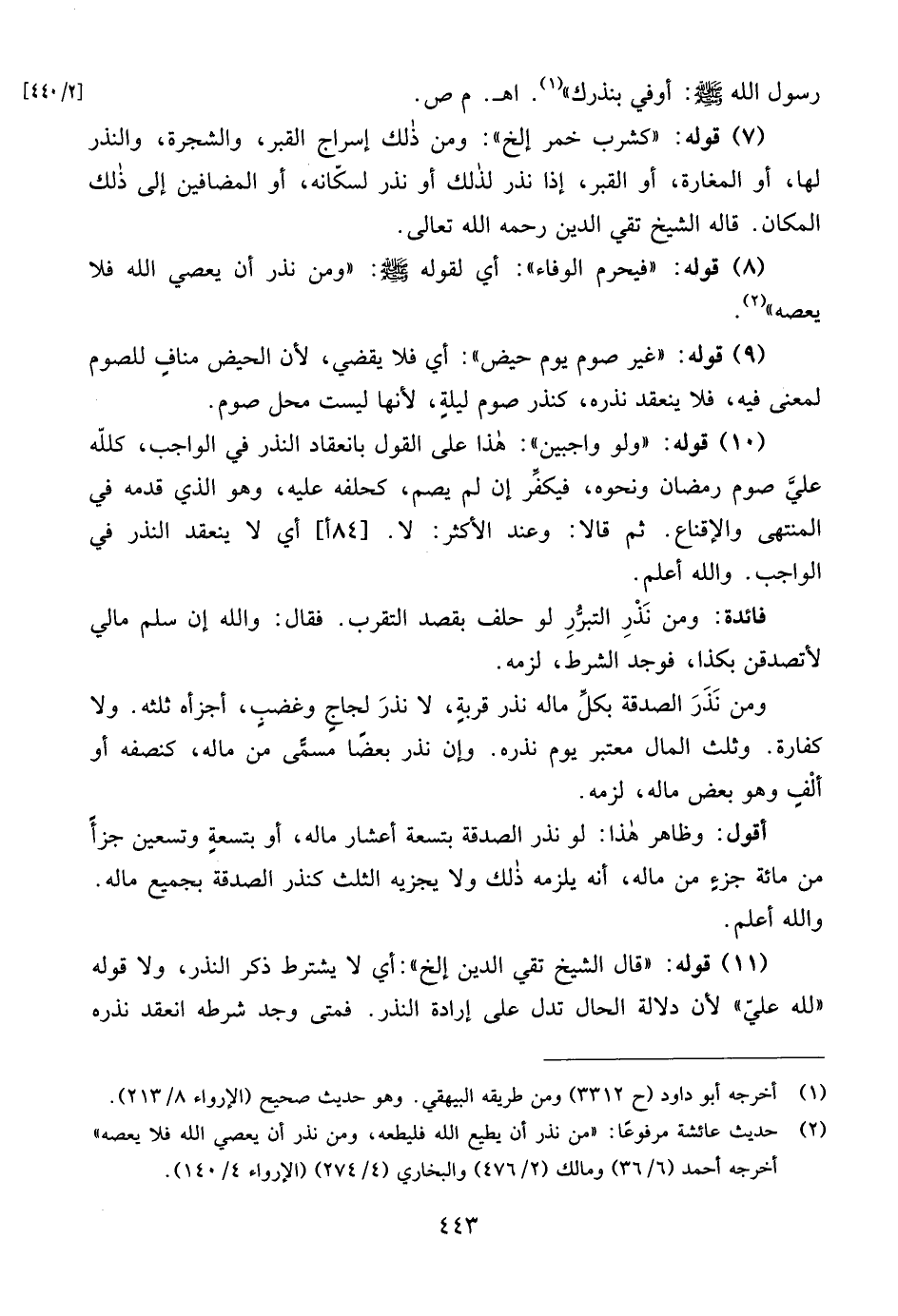 (¬2) حديث عائشة مرفوعًا: "من نذر أن يطيع الله فليطعه، ومن نذر أن يعصي الله فلا يعصه" أخرجه أحمد (6/ 36) ومالك (2/ 476) والبخاري (4/ 274) (الإرواء 4/ 0 4 1).