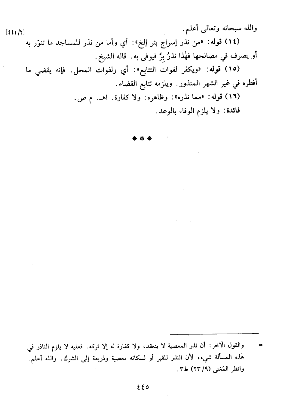 (14) قوله: "من نذر إسراج بئر إلخ": أي وأما من نذر للمساجد ما تنوّر به أو يصرف في مصالحها فهذا نذرُ بِرٍّ فيوفى به. قاله الشيخ.