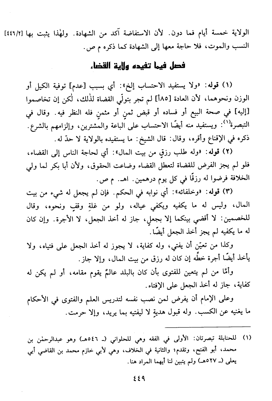(1) قوله: "ولا يستفيد إلاحتساب إلخ": أي بسبب [عدم] توفية الكيل أو الوزن ونحوهما، لأن العادة [85أ] لم تجر بتولّي القضاة لذلك، لكن إن تخاصموا [إليه] في صحة البيع أو فساده أو قبض ثمنِ أو مثمنٍ فله النظر فيه. وقال في التبصرة (¬1): ويستفيد منه أيضاً الاحتساب على الباعة والمشترين، وإلزامهم بالشرع.