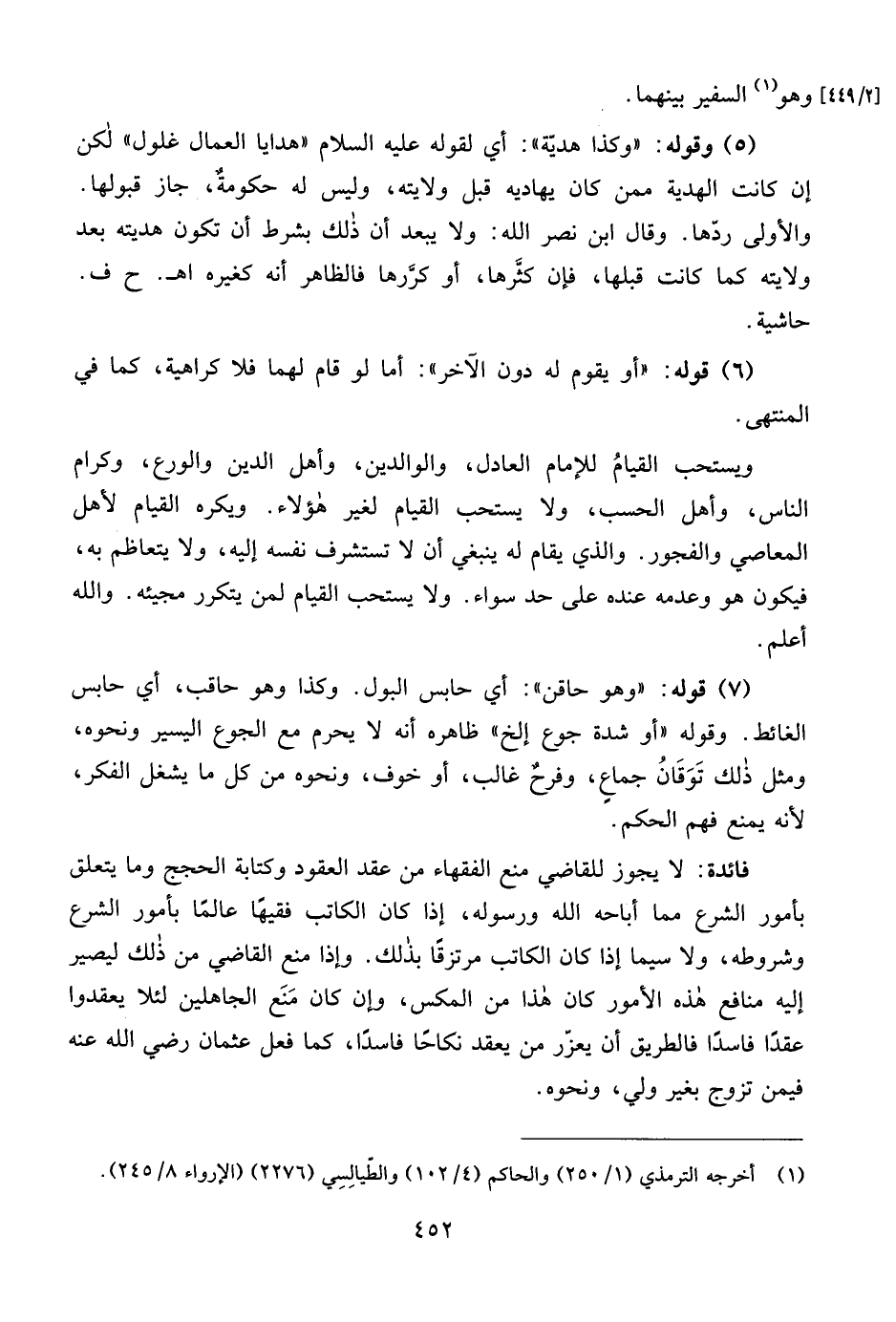 (5) وقوله: "وكذا هديّة": أي لقوله عليه السلام "هدايا العمال غلول" لكن إن كانت الهدية ممن كان يهاديه قبل ولايته، وليس له حكومةٌ، جاز قبولها.