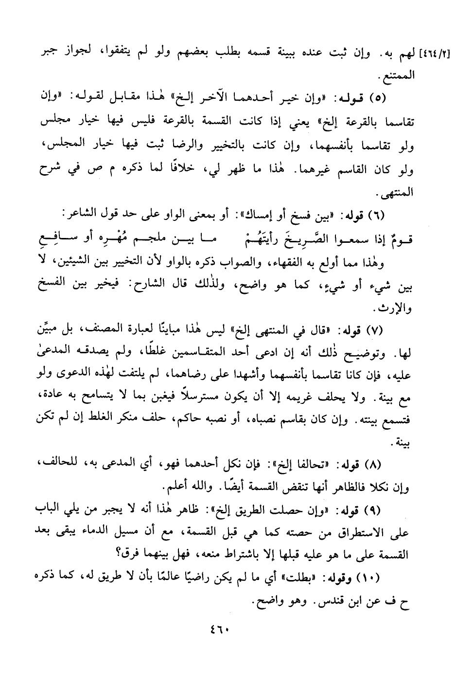 (5) قوله: "وإن خير أحدهما الآخر إلخ" هذا مقابل لقوله: "وإن تقاسما بالقرعة إلخ" يعني إذا كانت القسمة بالقرعة فليس فيها خيار مجلس ولو تقاسما بأنفسهما، وإن كانت بالتخيير والرضا ثبت فيها خيار المجلس، ولو كان القاسم غيرهما. هذا ما ظهر لي، خلافًا لما ذكره م ص في شرح المنتهى.