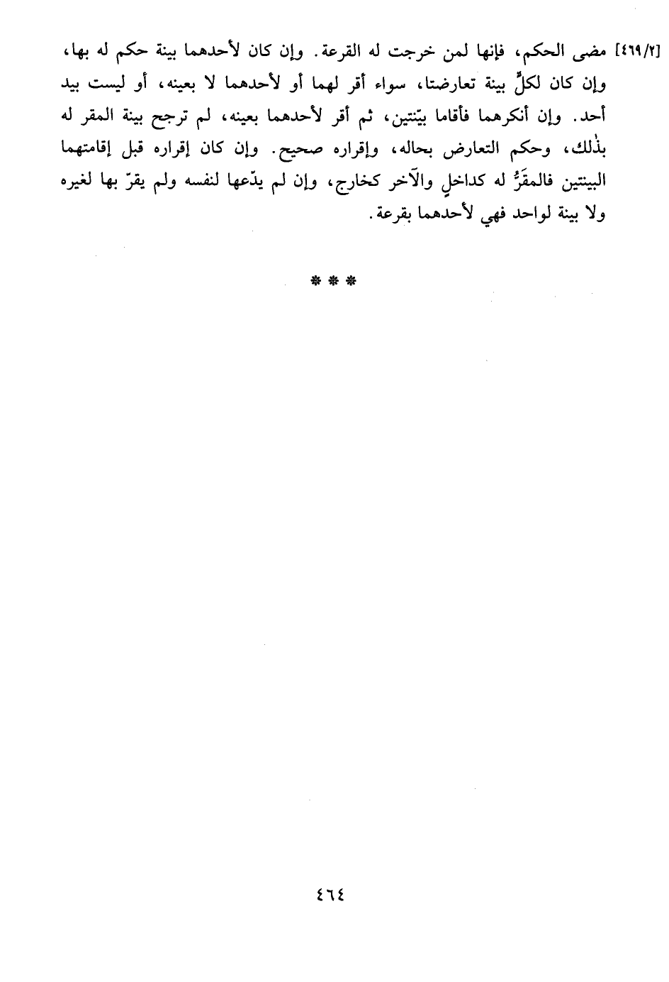 [2/ 469] مضى الحكم، فإنها لمن خرجت له القرعة. وإن كان لأحدهما بينة حكم له بها، وإن كان لكلٍّ بينة تعارضتا، سواء أقر لهما أو لأحدهما لا بعينه، أو ليست بيد أحد. وإن أنكرهما فأقاما بيّنتين، ثم أقر لأحدهما بعينه، لم ترجح بينة المقر له بذلك، وحكم التعارض بحاله، وإقراره صحيح. وإن كان إقراره قبل إقامتهما البينتين فالمقَرُّ له كداخلٍ والآخر كخارج، وإن لم يدّعها لنفسه ولم يقرّ بها لغيره ولا بينة لواحد فهي لأحدهما بقرعة.