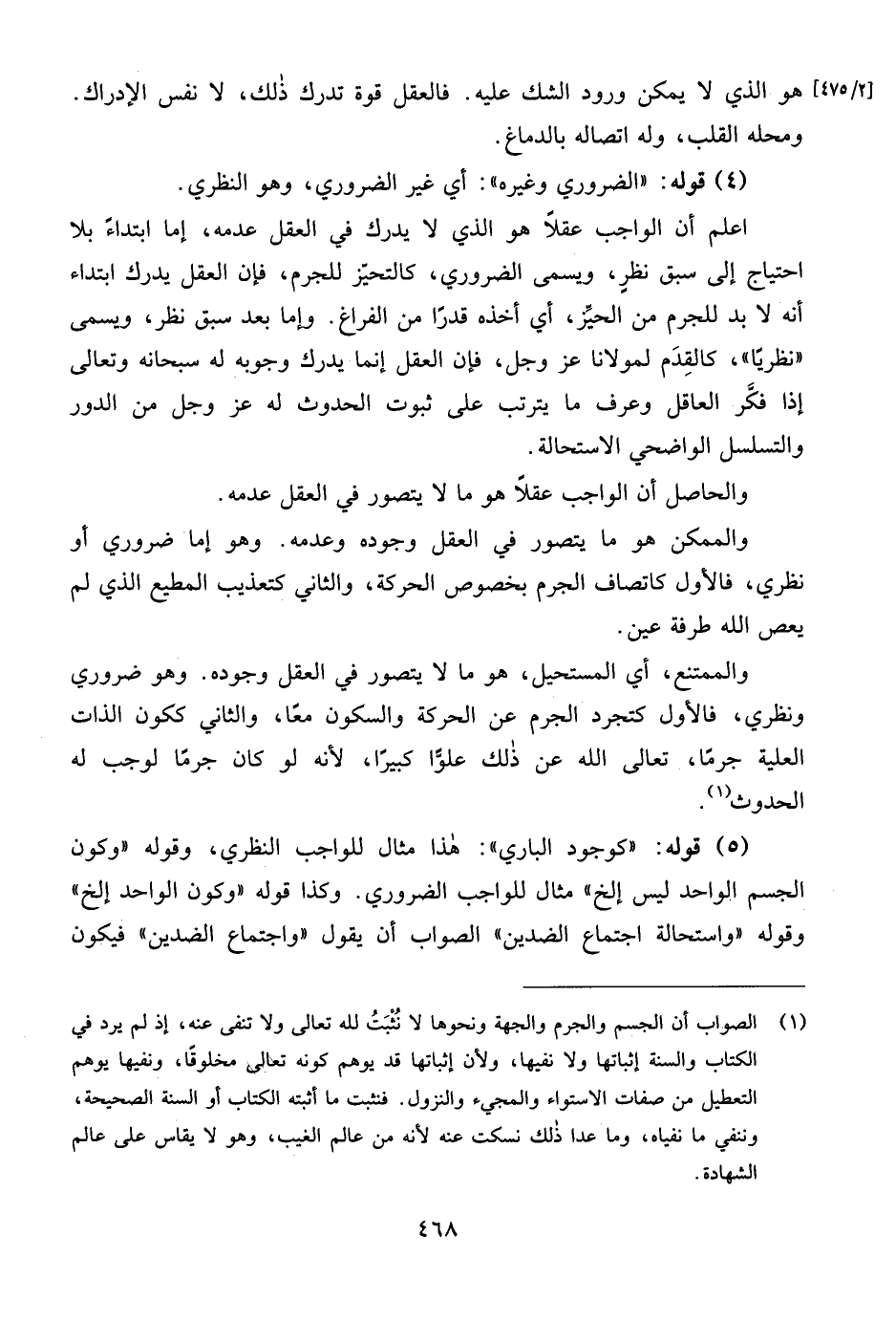 (¬1) الصواب أن الجسم والجرم والجهة ونحوها لا نُثْبَتُ لله تعالى ولا تنفى عنه، إذ لم يرد في الكتاب والسنة إثباتها ولا نفيها، ولأن إثباتها قد يوهم كونه تعالي مخلوقًا، ونفيها يوهم التعطيل من صفات الاستواء والمجيء والنزول. فمثبت ما أثبته الكتاب أو السنة الصحيحة، وننفي ما نفياه، وما عدا ذلك نسكت عنه لأنه من عالم الغيب، وهو لا يقاس على عالم الشهادة.
