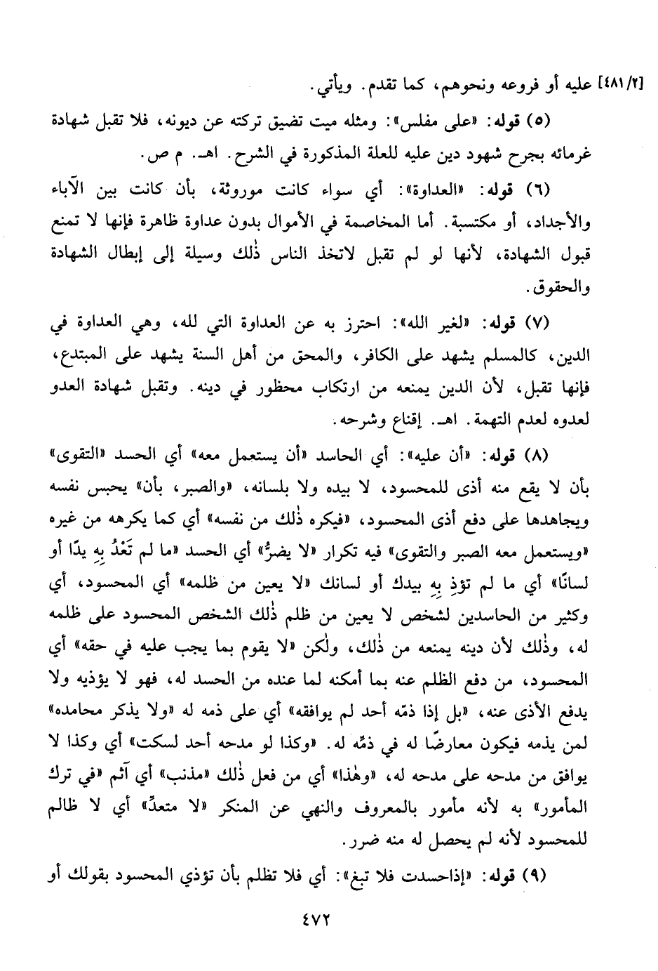(8) قوله: "أن عليه": أي الحاسد "أن يستعمل معه" أي الحسد "التقوى" بان لا يقع منه أذى للمحسود، لا بيده ولا بلسانه، "والصبر، بأن" يحبس نفسه ويجاهدها على دفع أذى المحسود، "فيكره ذلك من نفسه" أي كما يكرهه من غيره "ويستعمل معه الصبر والتقوى" فيه تكرار "لا يضرُّ" أي الحسد "ما لم تَعْدُ بِهِ يدًا أو لسانًا" أي ما لم تؤذِ بِهِ بيدك أو لسانك "لا يعين من ظلمه" أي المحسود، أي وكثير من الحاسدين لشخص لا يعين من ظلم ذلك الشخص المحسود على ظلمه له، وذلك لأن دينه يمنعه من ذلك، ولكن لا يقوم بما يجب عليه في حقه" أي المحسود، من دفع الظلم عنه بما أمكنه لما عنده من الحسد له، فهو لا يؤذيه ولا يدفع الأذى عنه، "بل إذا ذمّه أحد لم يوافقه" أي على ذمه له "ولا يذكر محامده" لمن يذمه فيكون معارضًا له في ذمِّه له. "وكذا لو مدحه أحد لسكت" أي وكذا لا يوافق من مدحه على مدحه له، "وهذا" أي من فعل ذلك "مذنب" أي آثم "في ترك المأمور" به لأنه مأمور بالمعروف والنهي عن المنكر "لا متعدِّ" أي لا ظالم للمحسود لأنه لم يحصل له منه ضرر.