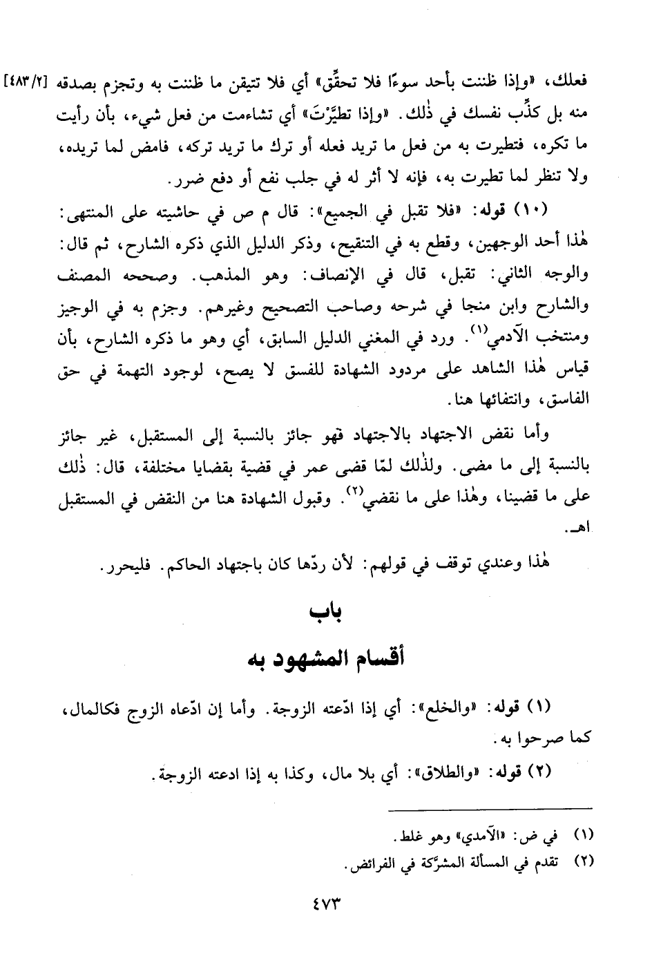 وأما نقض الاجتهاد بالاجتهاد فهو جائز بالنسبة إلى المستقبل، غير جائز بالنسبة إلى ما مضى. ولذلك لمّا قضى عمر في قضية بقضايا مختلفة، قال: ذلك على ما قضينا، وهذا على ما نقضي (¬2). وقبول الشهادة هنا من النقض في المستقبل اهـ.