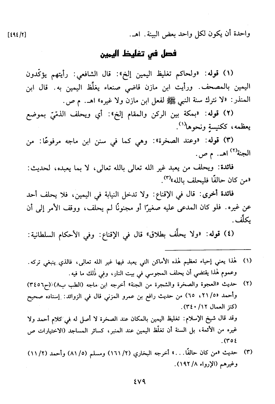 (1) قوله: "ولحاكم تغليظ اليمين إلخ": قال الشافعي: رأيتهم يؤكّدون اليمين بالمصحف. ورأيت ابن مازن قاضي صنعاء يغلِّظ اليمين به. قال ابن المنذر: "لا نترك سنة النبي - صلى الله عليه وسلم - لفعل ابن مازن ولا غيره" اهـ. م ص.