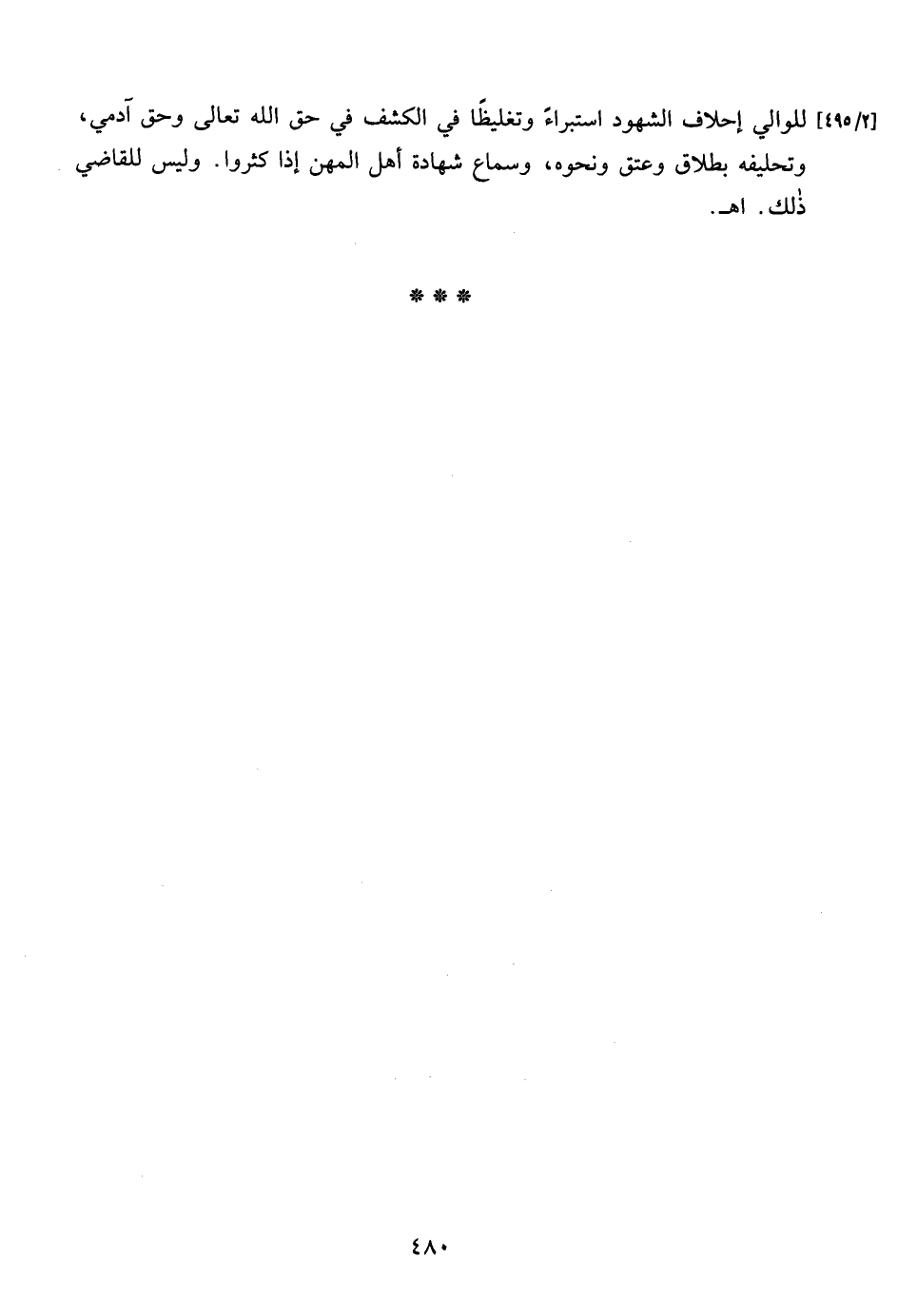 [2/ 495] للوالي إحلاف الشهود استبراءً وتغليظًا في الكشف في حق الله تعالى وحق آدمي، وتحليفه بطلاق وعتق ونحوه، وسماع شهادة أهل المهن إذا كثروا. وليس للقاضي ذلك. اهـ.