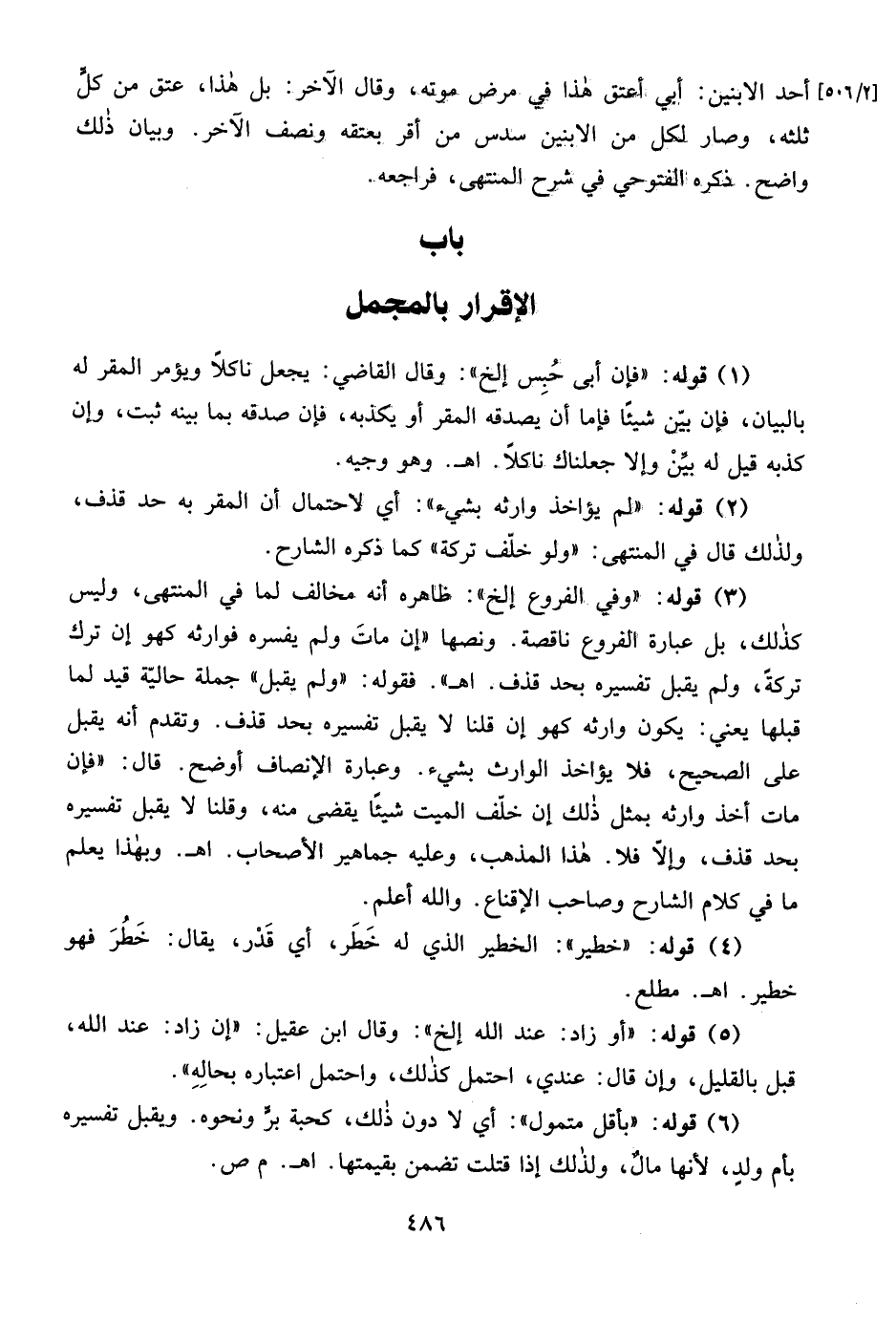 (3) قوله:"وفي الفروع إلخ": ظاهره أنه مخالف لما في المنتهى، وليس كذلك، بل عبارة الفروع ناقصة. ونصها "إن ماتَ ولم يفسره فوارثه كهو إن ترك تركةً، ولم يقبل تفسيره بحد قذف. اهـ". فقوله: "ولم يقبل" جملة حاليّة قيد لما قبلها يعني: يكون وارثه كهو إن قلنا لا يقبل تفسيره بحد قذف. وتقدم أنه يقبل على الصحيح، فلا يؤاخذ الواوث بشيء. وعبارة الإنصاف أوضح. قال: "فإن مات أخذ وارثه يمثل ذلك إن خلّف الميت شيئًا يقضى منه، وقلنا لا يقبل تفسيره بحد قذف، وإلاّ فلا. هذا المذهب، وعليه جماهير الأصحاب. اهـ. وبهذا يعلم ما في كلام الشارح وصاحب الإقناع. والله أعلم.