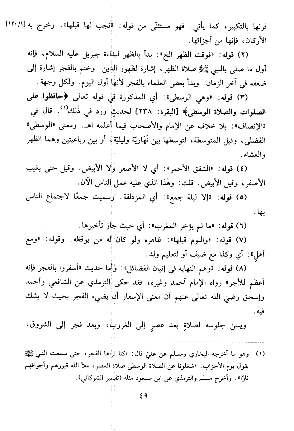 (8) قوله: "وهم النهاية في إتيان الفضائل": وأما حديث "أسفروا بالفجر فإنه أعظم للأجر" رواه الإمام أحمد وغيره، فقد حكى الترمذي عن الشافعي وأحمد وإسحق رضى الله تعالى عنهم أن معنى الإسفار أن يضيء الفجر بحيث لا يشك فيه.