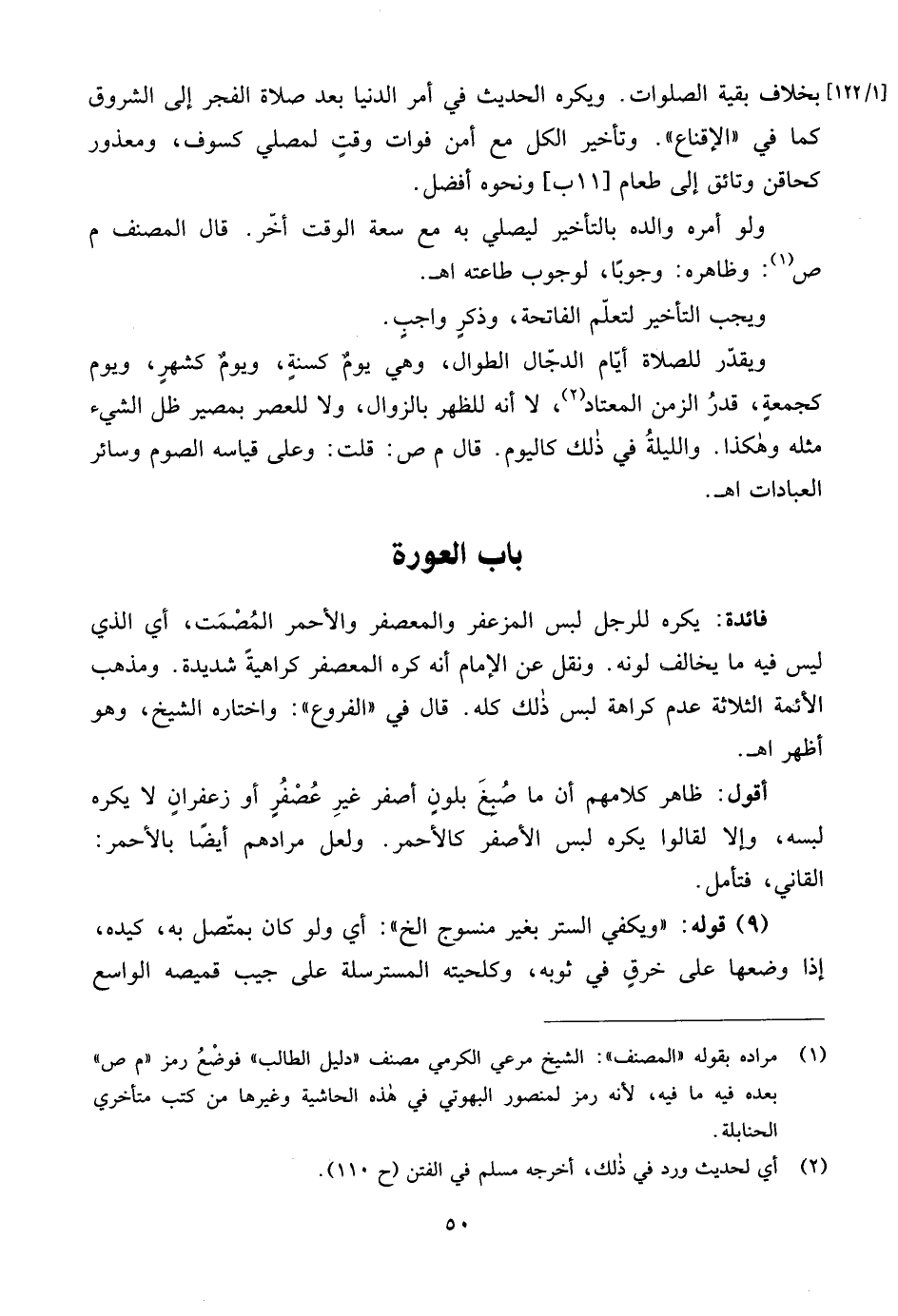 (¬1) مراده بقوله "المصنف": الشيخ مرعي الكرمي مصنف "دليل الطالب" فوضْعُ رمز "م ص" بعده فيه ما فيه، لأنه رمز لمنصور البهوتي في هذه الحاشية وغيرها من كتب متأخري الحنابلة.