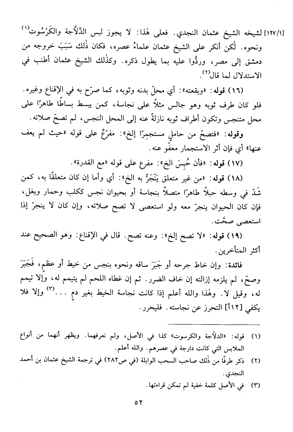 لشيخه الشيخ عثمان النجدي. فعلى لهذا: لا يجوز لبس الدَّلاَّجة والكَرْسُوت (¬1) ونحوه. لكن أنكر على الشيخ عثمان علماءُ عصره، فكان ذلك سَبَبَ خروجه من دمشق إلى مصر، وردُّوا عليه بما يطول ذكره. وكذلك الشيخ عثمان أطنب في الاستدلال لما قال (¬2).