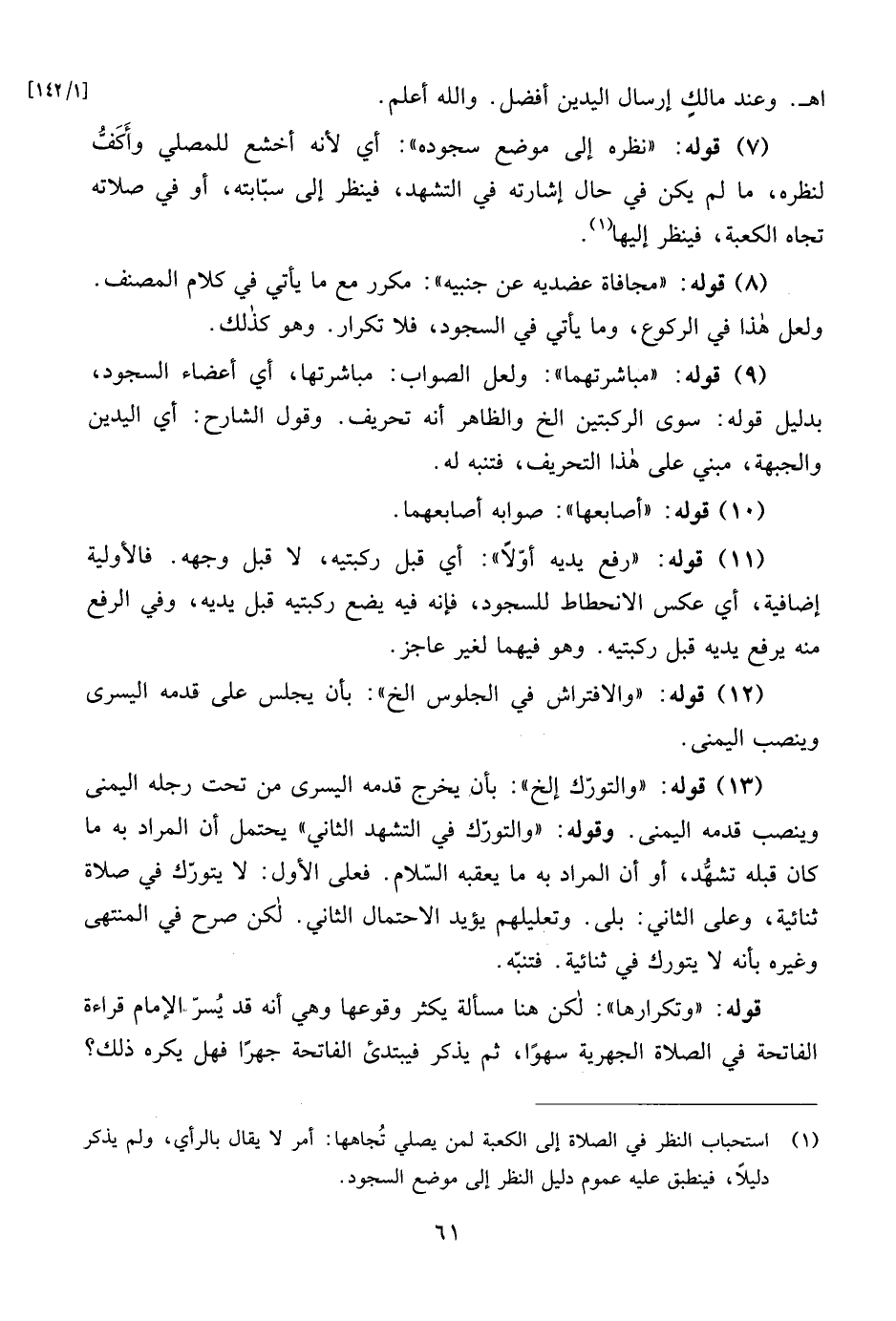 (7) قوله: "نظره إلى موضع سجوده": أي لأنه أخشع للمصلي وأَكفُّ لنظره، ما لم يكن في حال إشارته في التشهد، فينظر إلى سبّابته، أو في صلاته تجاه الكعبة، فينظر إليها (¬1).