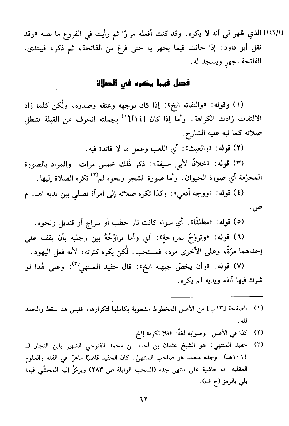 (¬3) حفيد المنتهي: هو الشيخ عثمان بن أحمد بن محمد الفتوحي الشهير بابن النجار (-1064 هـ). وجده محمد هو صاحب المنتهى. كان الحفيد قاضيًا ماهرًا في الفقه والعلوم العقلية. له حاشية على منتهى جده (السحب الوابلة ص 283) ويرمُزُ إليه المحشّي فيما يلي بالرمز (ح ف).