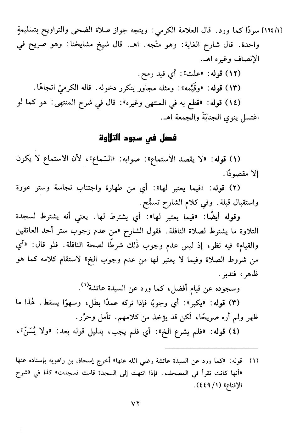 (¬1) قوله: "كما ورد عن السيدة عائشة رضي الله عنها" أخرج إسحاق بن راهويه لإسناده عنها "أنها كانت تقرأ في المصحف. فإذا انتهت إلى السجدة قامت فسجدت" كذا في "شرح الإقناع" (1/ 449).