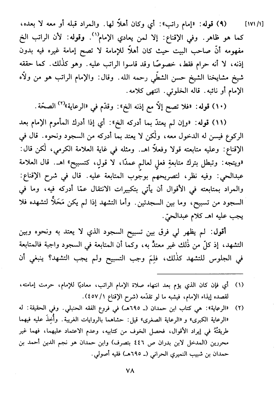 (¬2) "الرعاية": هي كتاب ابن حمدان (- 695 هـ) في فروع الفقه الحنبلي. وفي الحقيقة: له "الرعاية الكبرى" و"الرعاية الصغرى" قيل: حشاهما بالروايات الغريبة. واخِذَ عليه فيهما طريقتُهُ في إيراد الأقوال، فحصل الخوف من كتابيه، وعدم الاعتماد عليهما، فهما غير محررين (المدخل لابن بدران ص 446 بتصرف) وابن حمدان هو نجم الدين أحمد بن حمدان بن شبيب النميري الحراني (- 695 هـ) فقيه أصولي.