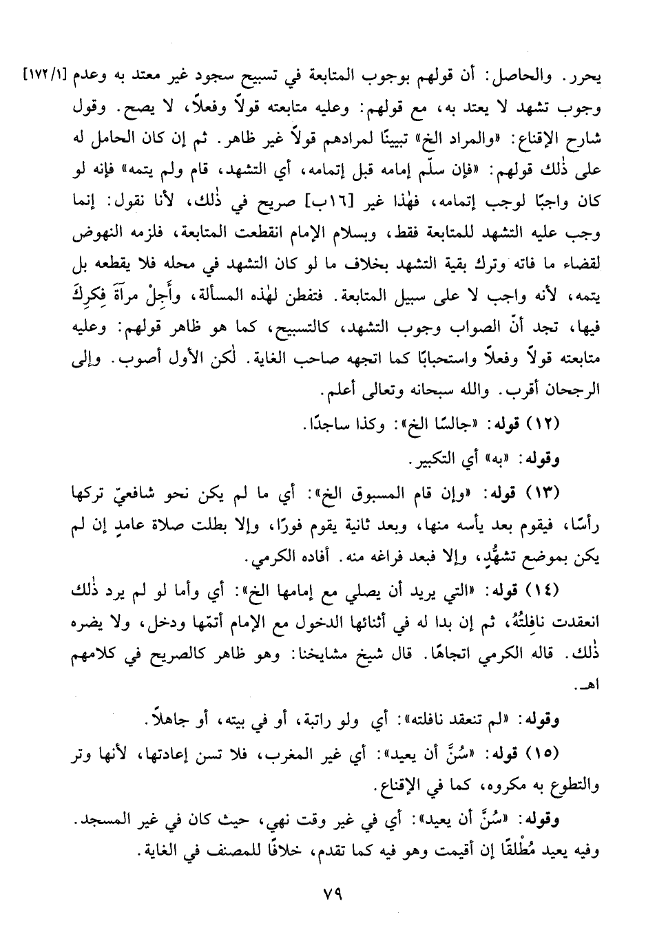 يحرر. والحاصل: أن قولهم بوجوب المتابعة في تسبيح سجود غير معتد به وعدم [1/ 172] وجوب تشهد لا يعتد به، مع قولهم: وعليه متابعته قولًاوفعلًا، لا يصح. وقول شارح الإقناع: "والمراد الخ" تبيينًا لمرادهم قولًا غير ظاهر. ثم إن كان الحامل له على ذلك قولهم: "فإن سلّم إمامه قبل إتمامه، أي التشهد، قام ولم يتمه" فإنه لو كان واجبًا لوجب إتمامه، فيذا غير [16ب]، صريح في ذلك، لأنا نقول: إنما وجب عليه التشهد للمتابعة فقط، وبسلام الإمام انقطعت المتابعة، فلزمه النهوض لقضاء ما فاته وترك بقية التشهد بخلاف ما لو كان التشهد في محله فلا يقطعه بل يتمه، لأنه واجب لا على سبيل المتابعة. فتفطن لهذه المسألة، وأَجِلْ مرآةَ فِكرِكَ فيها، تجد أنّ الصواب وجوب التشهد، كالتسبيح، كما هو ظاهر قولهم: وعليه متابعته قولًا وفعلًا واستحبابًا كما اتجهه صاحب الغاية. لكن الأول أصوب. وإلى الرجحان أقرب. والله سبحانه وتعالى أعلم.