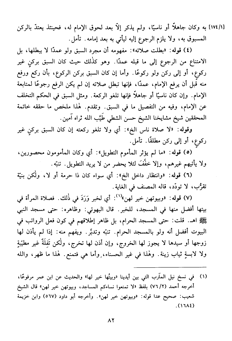 (4) قوله: "بطلت صلاته": مفهومه أن مجرد السبق ولو عمدًا لا يبطلها، بل الامتناع من الرجوع إلى ما قبله عمدًا. وهو كذلك حيث كان السبق بركنٍ غير ركوعٍ، أو إلى ركن ولو ركوعًا. وأما إن كان السبق بركن الركوع، بأن ركع ورفع منه قبل أن يرفع الإمام، عمدًا، فإنها تبطل صلاته إن لم يكن الرفع رجوعًا لمتابعة الإمام. وإن كان ناسيًا أو جاهلًا فإنها تلغو الركعة. ومثل السبق في الحكم التخلف عن الإمام، وفيه من التفصيل ما في السبق. وتقدم. هذا ملخص ما حققه خاتمة المحققين شيخ مشايخنا الشيخ حسن الشطي طَيَّب الله ثراه آمين.