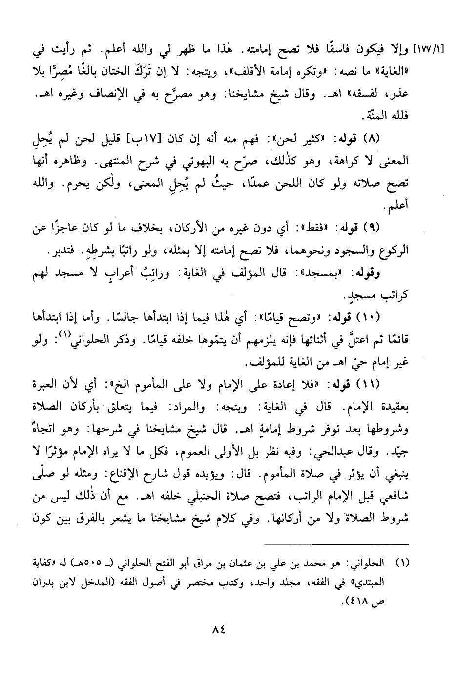 [1/ 177] وإلا فيكون فاسقًا فلا تصح إمامته. هذا ما ظهر لي والله أعلم. ثم رأيت في "الغاية" ما نصه: "وتكره إمامة الأقلف"، ويتجه: لا إن تَرَكَ الختان بالغًا مُصِرًّا بلا عذر، لفسقه" اهـ. وقال شيخ مشايخنا: وهو مصرَّح به في الإنصاف وغيره اهـ. فلله المنّة.