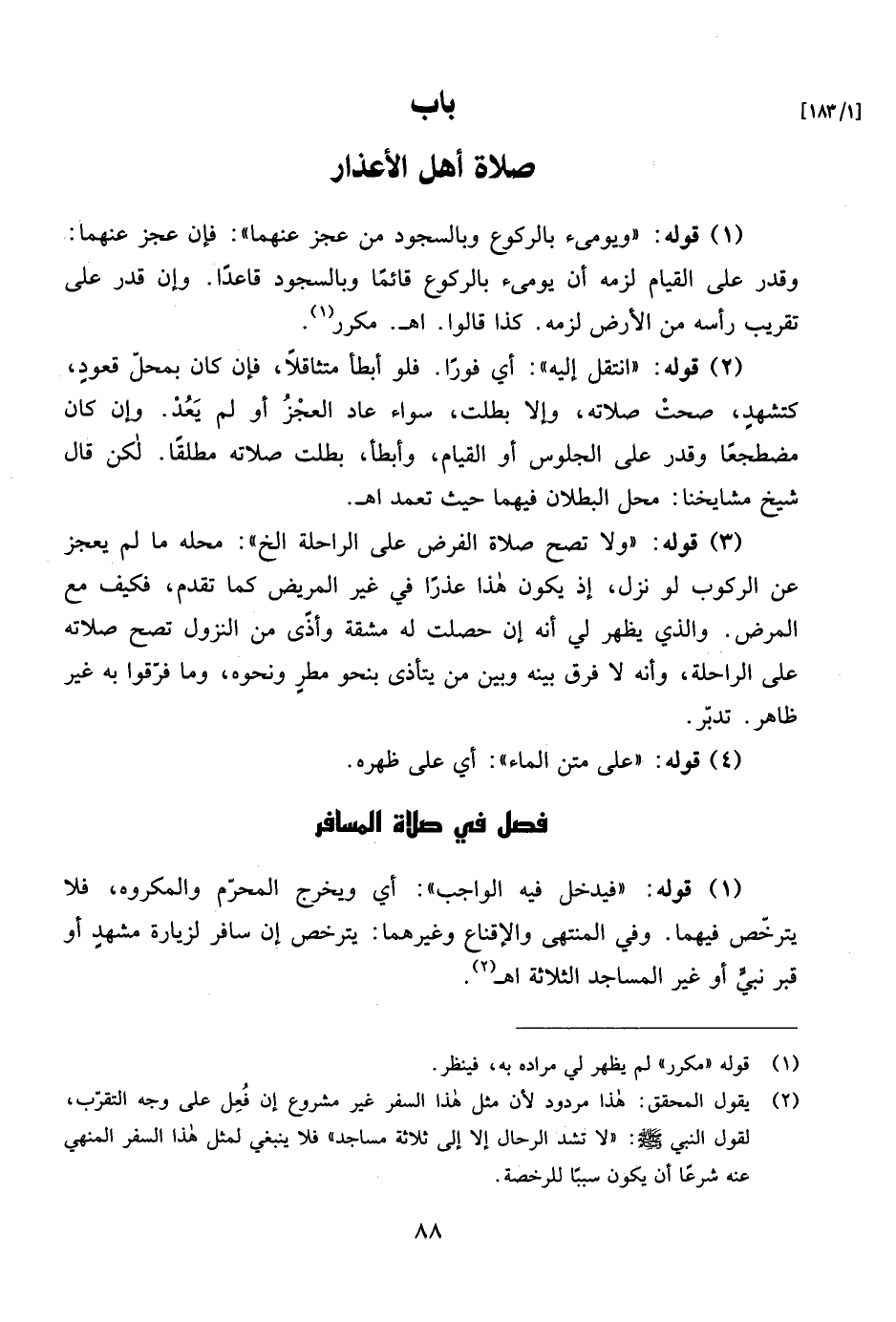 (3) قوله: "ولا تصح صلاة الفرض على الراحلة الخ": محله ما لم يعجز عن الركوب لو نزل، إذ يكون هذا عذرًا في غير المريض كما تقدم، فكيف مع المرض. والذي يظهر لي أنه إن حصلت له مشقة وأذًى من النزول تصح صلاته على الراحلة، وأنه لا فرق بينه وبين من يتأذى بنحو مطرٍ ونحوه، وما فرّقوا به غير ظاهر. تدبّر.