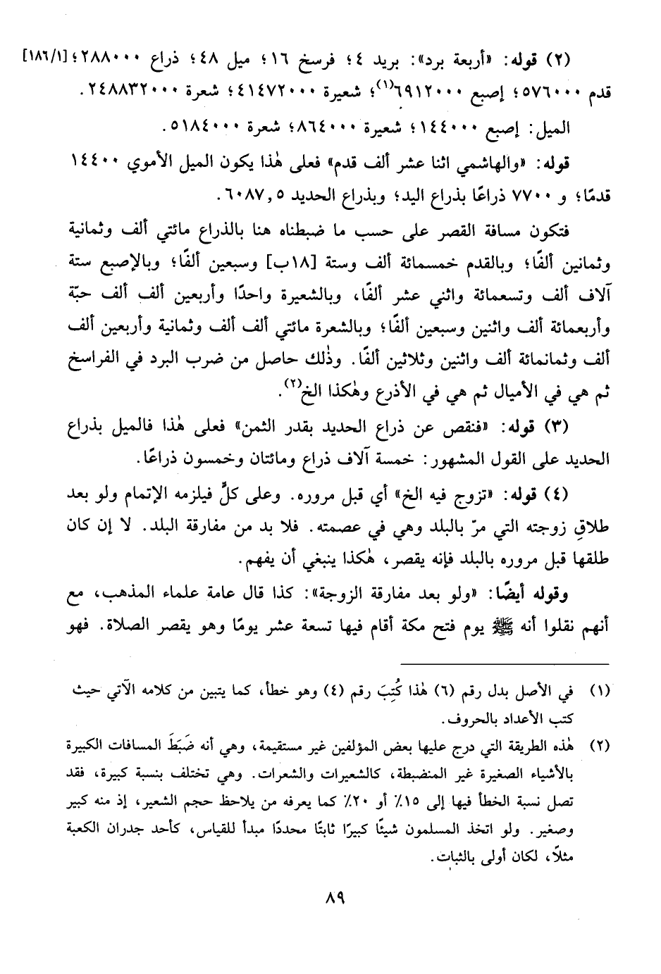 (¬2) هذه الطريقة التي درج عليها بعض المؤلفين غير مستقيمة، وهي أنه ضَبَطَ المسافات الكبيرة بالأشياء الصغيرة غير المنضبطة، كالشعيرات والشعرات. وهي تختلف بنسبة كبيرة، فقد تصل نسبة الخطأ فيها إلى 15% أو 20% كما يعرفه من يلاحظ حجم الشعير، إذ منه كبير وصغير. ولو اتخذ المسلمون شيئًا كبيرًا ثابتًا محددًا مبدأ للقياس، كأحد جدران الكعبة مثلاً، لكان أولى بالثبات.