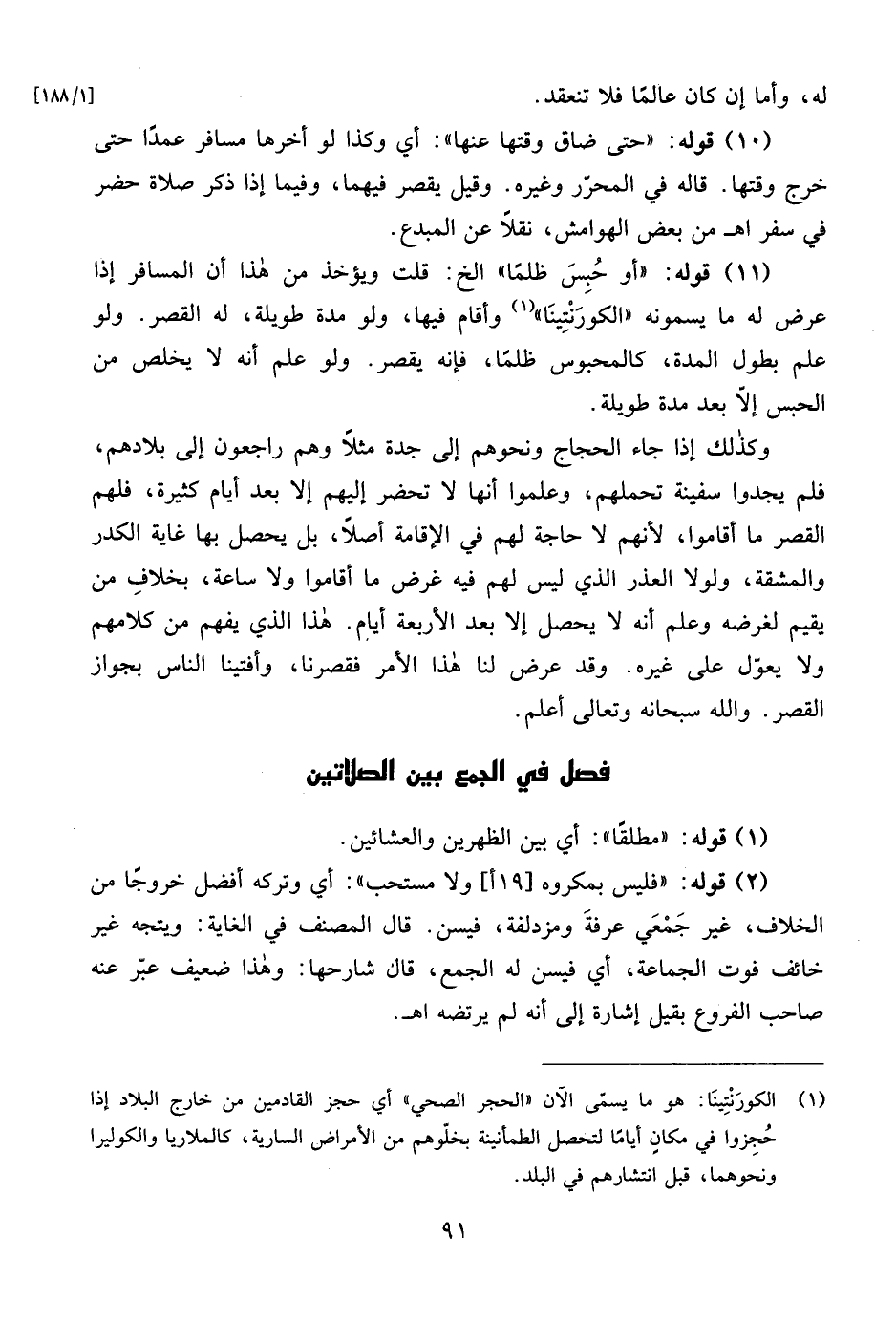 (11) قوله: "أو حُبِسَ ظلمًا" الخ: قلت ويؤخذ من هذا أن المسافر إذا عرض له ما يسمونه "الكورَنْتِينَا" (¬1) وأقام فيها، ولو مدة طويلة، له القصر. ولو علم بطول المدة، كالمحبوس ظلمًا، فإنه يقصر. ولو علم أنه لا يخلص من الحبس إلاَّ بعد مدة طويلة.