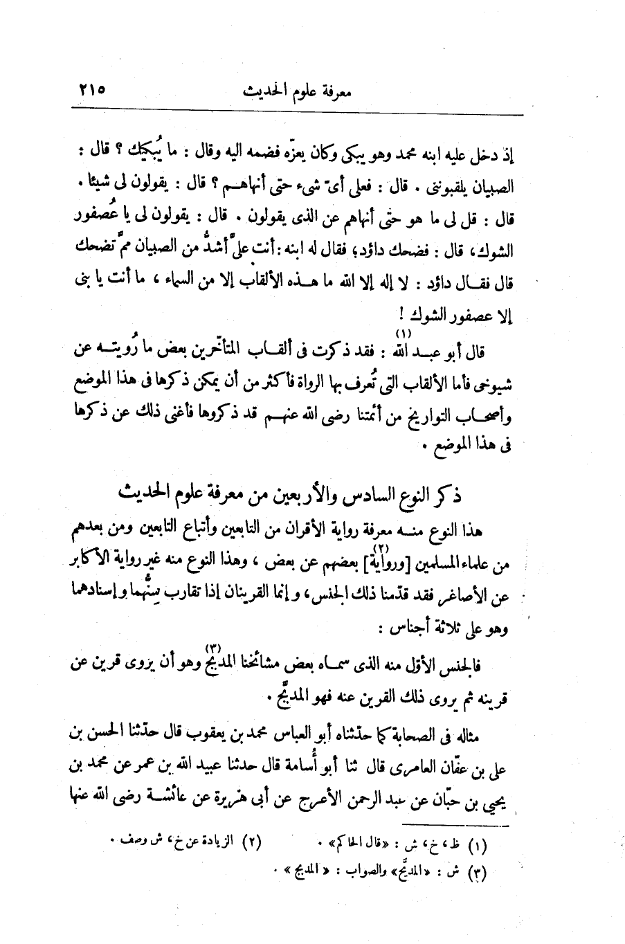 §ذِكْرُ النَّوْعِ السَّادِسِ وَالْأَرْبَعِينَ مِنْ مَعْرِفَةِ عُلُومِ الْحَدِيثِ هَذَا النَّوْعُ مِنْهُ مَعْرِفَةُ رِوَايَةِ الْأَقْرَانِ مِنَ التَّابِعِينَ، وَأَتْبَاعِ التَّابِعِينَ، وَمَنْ بَعْدَهُمْ مِنْ عُلَمَاءِ الْمُسْلِمِينَ، وَرِوَايَةِ بَعْضُهُمْ عَنْ بَعْضٍ، وَهَذَا النَّوْعُ مِنْهُ غَيْرُ رِوَايَةِ الْأَكَابِرِ عَنِ الْأَصَاغِرِ، فَقَدْ قَدَّمْنَا ذَلِكَ الْجِنْسَ، وَإِنَّمَا الْقَرِينَانِ إِذَا تَقَارَبَ سِنُّهُمَا، وَإِسْنَادُهُمَا وَهُوَ عَلَى ثَلَاثَةِ أَجْنَاسٍ: فَالْجِنْسُ الْأَوَّلُ مِنْهُ الَّذِي سَمَّاهُ بَعْضُ مَشَايِخِنَا الْمُدَبَّجَ، وَهُوَ أَنْ يَرْوِيَ قَرِينٌ عَنْ قَرِينِهِ، ثُمَّ يَرْوِي ذَلِكَ الْقَرِينُ عَنْهُ، فَهُوَ الْمُدَبَّجُ، مِثَالُهُ فِي الصَّحَابَةِ كَمَا