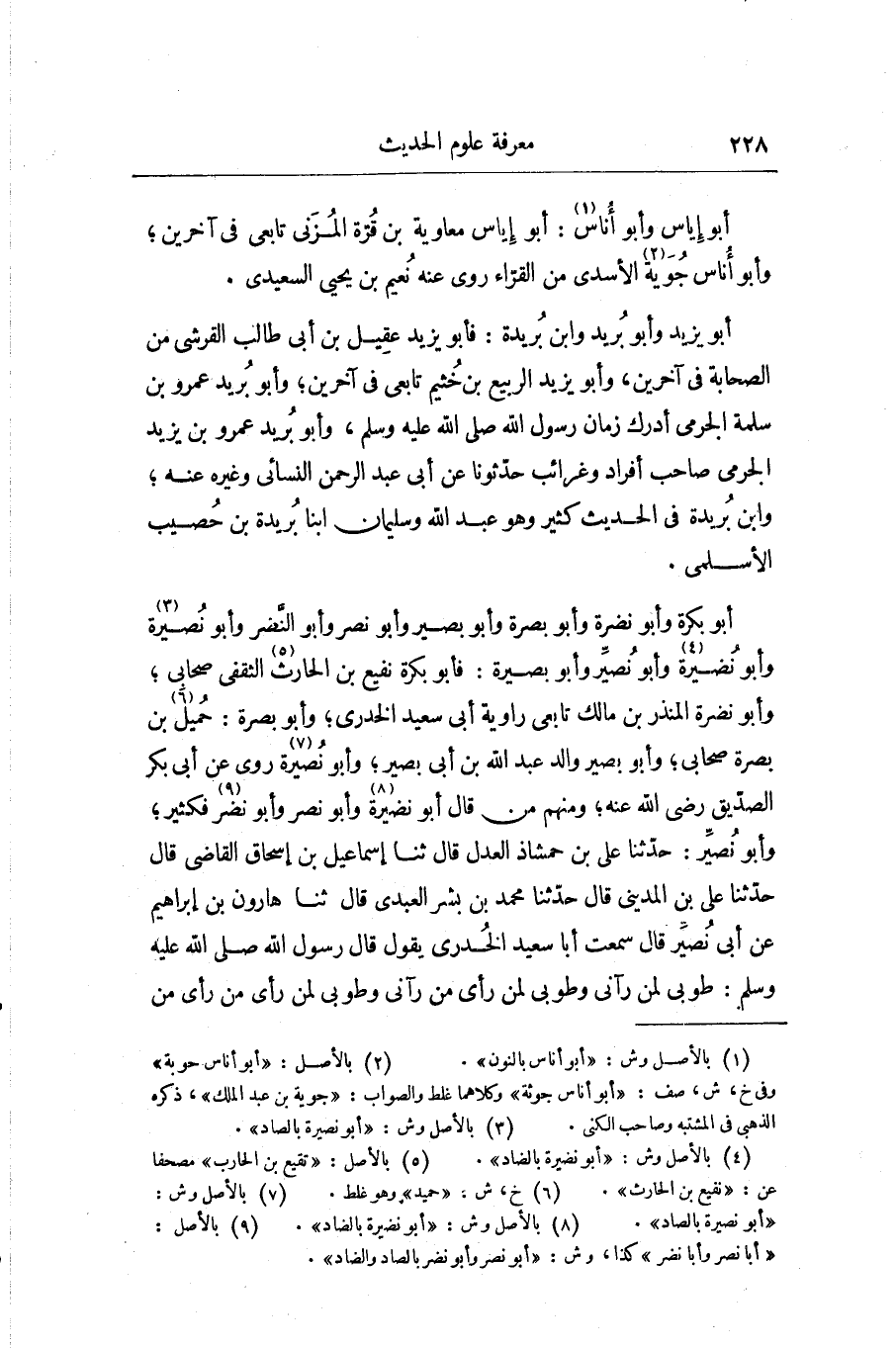حَدَّثَنَا عَلِيُّ بْنُ حَمْشَاذٍ الْعَدْلُ قَالَ: ثنا إِسْمَاعِيلُ بْنُ إِسْحَاقَ الْقَاضِي قَالَ: حَدَّثَنَا عَلِيُّ بْنُ الْمَدِينِيِّ قَالَ: حَدَّثَنَا مُحَمَّدُ بْنُ بِشْرٍ الْعَبْدِيُّ قَالَ: ثنا هَارُونُ بْنُ إِبْرَاهِيمَ , عَنْ أَبِي نُصَيْرٍ، قَالَ: سَمِعْتُ أَبَا سَعِيدٍ الْخُدْرِيَّ يَقُولُ: قَالَ رَسُولُ اللَّهِ صَلَّى اللهُ عَلَيْهِ وَسَلَّمَ: «§طُوبَى لِمَنْ رَآنِي، وَطُوبَى لِمَنْ رَأَى مَنْ رَآنِي، وَطُوبَى لِمَنْ رَأَى مَنْ رَأَى مَنْ رَآنِي» قَالَ: عَلِيُّ أَبُو نُصَيْرٍ مَجْهُولٌ وَأَبُو نُصَيْرَةَ مُسْلِمُ بْنُ عُبَيْدٍ رَوَى عَنْهُ يَزِيدُ بْنُ هَارُونَ وَأَبُو بَصِيرَةَ الْأَنْصَارِيُّ لَهُ ذِكْرٌ فِي الْمَغَازِي أَبُو مَعْبَدٍ، وَأَبُو مُعَيْدٍ، فَأَمَّا أَبُو مَعْبَدٍ فَجَمَاعَةٌ مِنْهُمْ: صَاحِبُ عَبْدِ اللَّهِ بْنِ عَبَّاسٍ، وَأَبُو مُعَيْدٍ حَفْصُ بْنُ غَيْلَانَ الدِّمَشْقِيُّ -[229]- الْجِنْسُ الْخَامِسُ مِنْ هَذَا النَّوْعِ: الْمُتَشَابِهُ فِي صَنَاعَاتِ الرُّوَاةِ: الْجَزَّارُ، وَالْخَرَّازُ، وَالْحَمَّارُ، وَالْخَبَّازُ، وَالْخَزَّازُ، وَالْجَرَّارُ، فَأَمَّا الْجَزَّارُونَ، فَمِنْهُمْ: شَيْخُنَا عَبْدُ الرَّحْمَنِ بْنُ حَمْدَانَ الْهَمْدَانِيُّ، سَمِعَ الْمُسْنَدَ مِنْ إِبْرَاهِيمَ بْنِ نَصْرٍ الرَّازِيِّ، وَالْمُسْنَدَ مِنْ هِلَالِ بْنِ الْعَلَاءِ الرَّقِّيِّ، فَأَمَّا الْخَرَّازُ، فَعَبْدُ اللَّهِ بْنُ عَوْنٍ شَيْخٌ كَبِيرٌ مِنْ أَهْلِ الْعِرَاقِ، وَأَمَّا أَبُو عُثْمَانَ سَعِيدُ بْنُ عُثْمَانَ الْخَرَّازُ، فَحَدَّثُونَا عَنْهُ، عَنْ أَبِي بَكْرِ بْنِ أَبِي شَيْبَةَ، وَغَيْرُهُ وَأَمَّا أَحْمَدُ بْنُ مُوسَى بْنِ إِسْحَاقَ الْحِمَّارُ، فَحَدَّثُونَا عَنْهُ، عَنْ أَبِي نُعَيْمٍ وَابْنِ الْأَصْبَهَانِيِّ، وَأَمَّا الْخَبَّازُونَ، فِيهِمْ كَثْرَةٌ فِي الطَّبَقَةِ الْخَامِسَةِ، وَأَمَّا الْخَزَّازُونَ، فَمِنْهُمْ أَبُو عَامِرٍ صَالِحُ بْنُ رُسْتُمَ الْبَصْرِيُّ الْخَزَّازُ، سَمِعَ الْحَسَنَ بْنَ أَبِي الْحَسَنِ، وَعَبْدَ اللَّهِ بْنَ أَبِي مُلَيْكَةَ، وَمِنْهُمْ أَبُو حَنِيفَةَ النُّعْمَانُ بْنُ ثَابِتٍ الْفَقِيهُ، وَأَمَّا الْجَرَّارُ، فَإِنَّ أَبَا مَسْعُودٍ الْجَرَّارَ الْكُوفِيَّ عِنْدَهُ مِنَ الشَّعْبِيِّ وَإِبْرَاهِيمَ النَّخَعِيِّ الْبَقَّالُ، وَالنَّقَّالُ، وَالنَّبَّالُ: أَبُو سَعْدٍ سَعِيدُ بْنُ الْمَرْزُبَانِ الْبَقَّالُ الْكُوفِيُّ تَابِعِيُّ وَالْحَارِثُ بْنُ سُرَيْجٍ النَّقَّالُ مِنْ كِبَارِ الْمُحَدِّثِينَ، وَعِدَادُهُ فِي الْبَغْدَادِيِّينَ، وَهُوَ الَّذِي حَمَلَ كِتَابَ الرِّسَالَةِ مِنْ يَدِ الشَّافِعِيِّ إِلَى عَبْدِ الرَّحْمَنِ بْنِ مَهْدِيٍّ وَأَمَّا النَّبَّالُ فَعُمَرُ بْنُ سُلَيْمَانَ، وَأَظُنُّهُ مِنْ أَهْلِ الْبَصْرَةِ حَدَّثَ عَنْ سُلَيْمَانَ بْنِ حَرْبٍ وَغَيْرِهِ الْبَزَّازُ، وَالْبَزَّارُ، وَالتَّمَّارُ، فَأَمَّا الْبَزَّازُونَ، فَفِيهِمْ كَثْرَةٌ، مِنْهُمْ عَبْدُ اللَّهِ بْنُ مُحَمَّدِ بْنِ نَاجِيَةَ مُحَدِّثُ بَغْدَادَ، وَأَبُو يَحْيَى زَكَرِيَّا بْنُ يَحْيَى الْبَزَّازُ، مُحَدِّثُ بَلَدِنَا فِي عَصْرِهِ، وَكَذَلِكَ الْبَزَّارُونَ، وَمِنْهُمْ عُبَيْدُ بْنُ شَرِيكٍ، سَمِعَ ابْنَ أَبِي مَرْيَمَ، وَابْنَ عُفَيْرٍ وَالتَّمَّارُونَ كَثِيرٌ، مِنْهُمْ عُبَيْدُ بْنُ عُبَيْدَةَ بْنِ مُرَّةَ التَّمَّارُ الْبَصْرِيُّ صَاحِبُ أَحَادِيثِ سُلَيْمَانَ التَّيْمِيِّ، وَهُوَ ثِقَةٌ يُغْرِبُ الْغَسَّالُ وَالْعَسَّالُ عَبْدُ اللَّهِ بْنُ مُحَمَّدِ بْنِ نُوحٍ الْغَسَّالُ الْمَرْوَزِيُّ، رَوَى عَنْ صَخْرِ بْنِ مُحَمَّدٍ الْحَاجِبِيِّ، وَأَحْمَدَ بْنِ عَبْدِ اللَّهِ الْفِرْيَانَانِيُّ حَدَّث